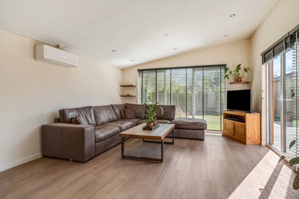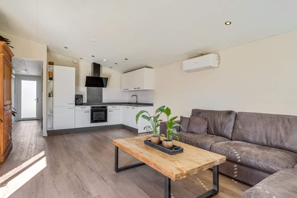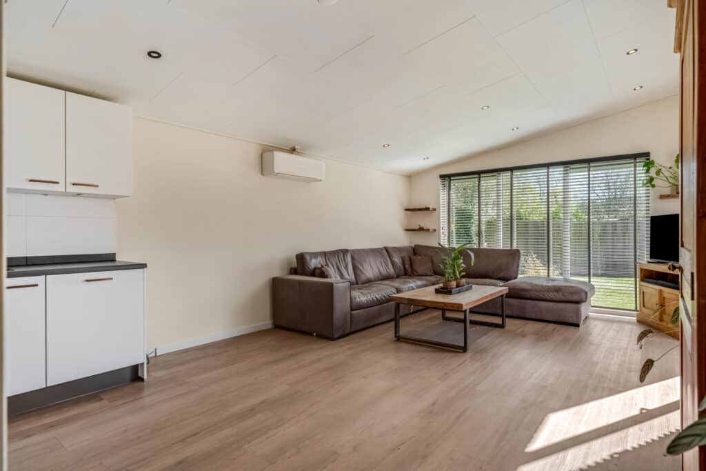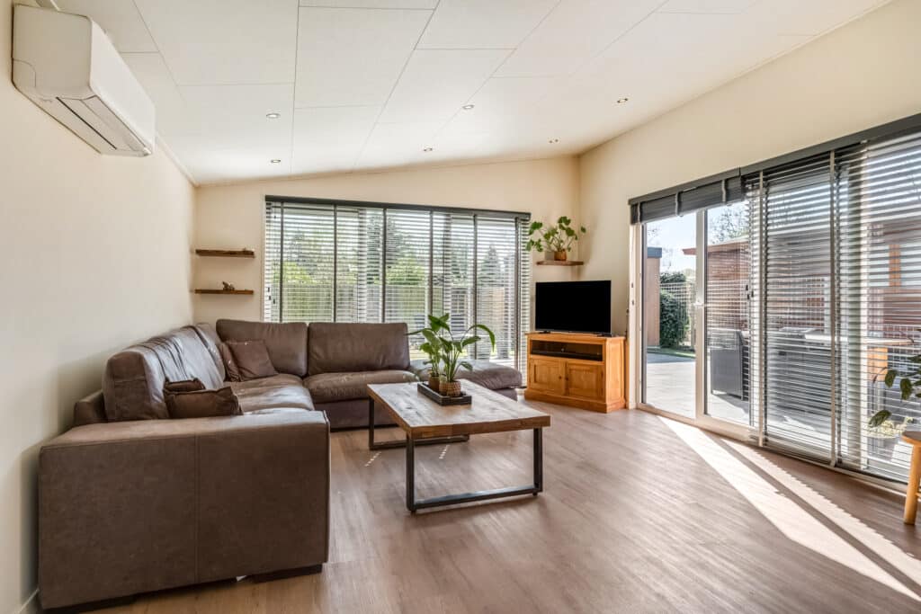 De woonkamer is een oase van licht en ruimte, met een hoog plafond, ingebouwde spots en kamerhoge raampartijen die de ruimte overspoelen met natuurlijk licht. Met een aircosysteem en een schuifpui naar het terras, is dit de perfecte plek om te ontspannen en te genieten van het uitzicht op je eigen domein, ongeacht het seizoen.