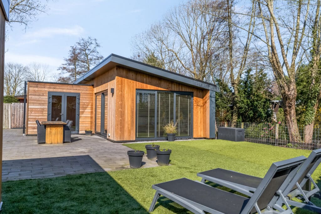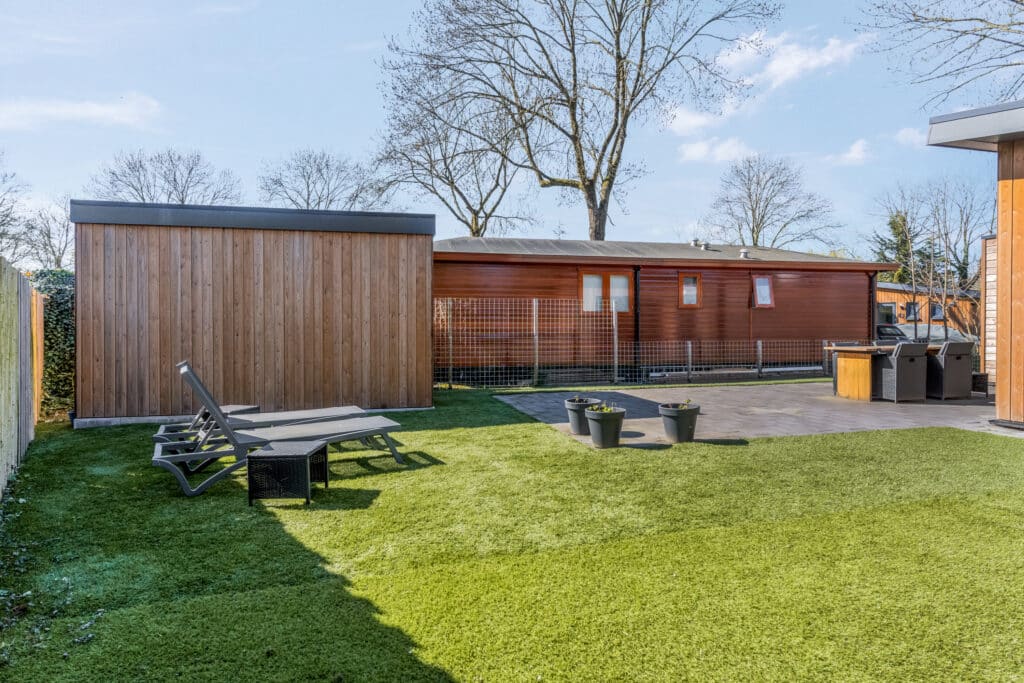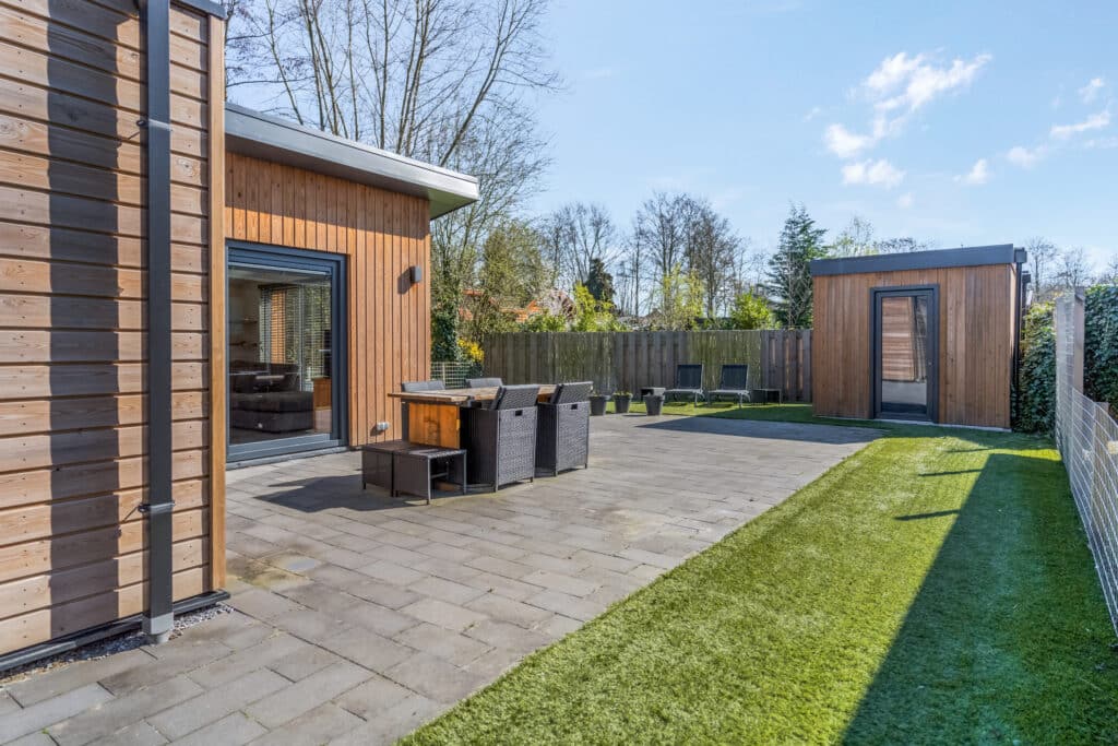 De tuin is strak, maar toch zeer sfeervol ingericht. Deze ademt het bos en het buitenleven. Door speelsheid tussen groen en betegeling is hier optimaal voldaan aan het idee waar het leven hier voor staat! Door de verschillende mogelijkheden van terrassen kan je in de zomer kiezen voor zowel schaduw als zon. Verder is de achtertuin nog voorzien van een separate berging die in dezelfde stijl als de woning is opgebouwd. Ideaal voor tuingereedschap, fietsen, etc.