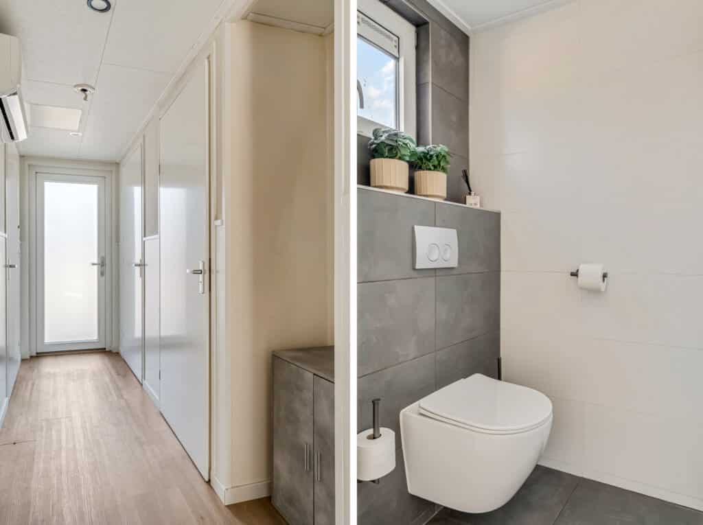 Stap de hal binnen en laat je verwelkomen door de PVC vloer met vloerverwarming, een voorproefje van de stijlvolle afwerking die je door het hele huis zult vinden. Bewonder de uitgebreide moderne meterkast. En vergeet niet het moderne toilet met fontein en de handige garderobe nis, die het gemak en comfort van dit huis verder benadrukken. In deze entree vinden we de toegang tot alle leefruimtes binnen deze woning. Hier is ook een airco geïnstalleerd om te koelen.