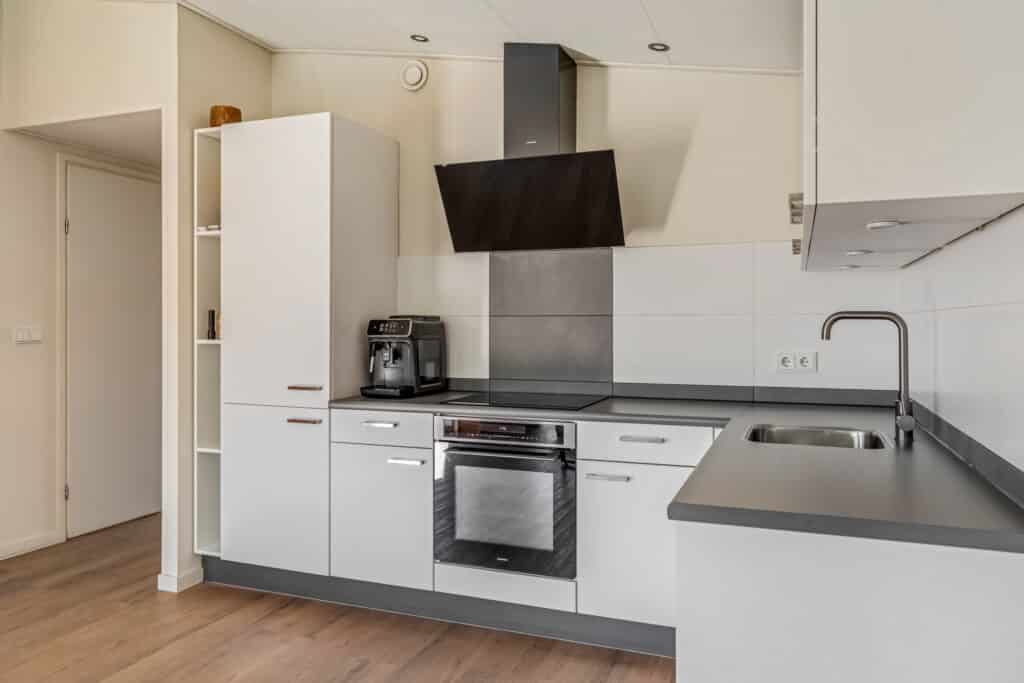 In het hart van de woning vind je o.a. de keuken. Deze L-vormige keuken is niet alleen modern, maar ook voorzien van allerlei gemakken. Met een combi-oven, een inductiekookplaat met design afzuigkap, koel/vriescombinatie en spoelbak, zal koken hier een waar genot zijn.