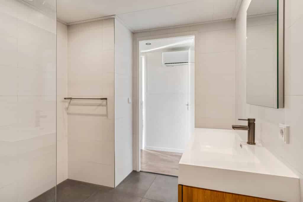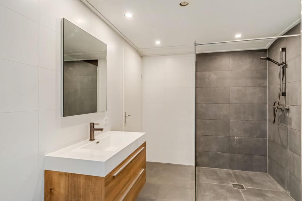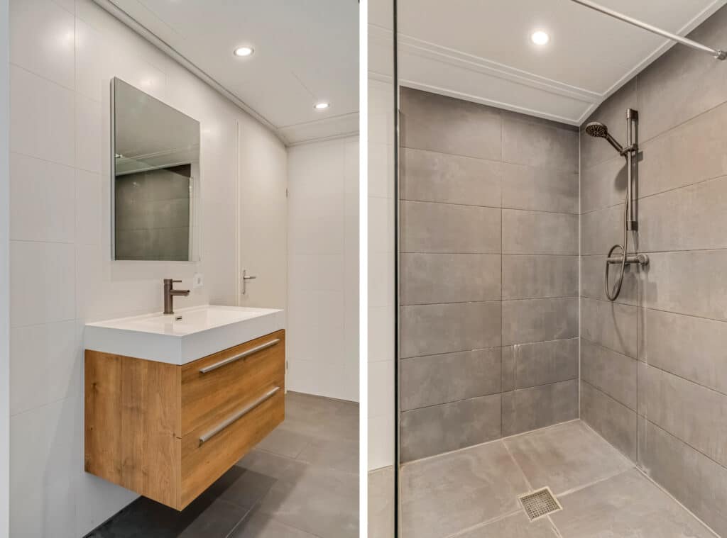 En last but not least, de badkamer – een heerlijke ruimte van rust en verfijning. Met een ruime inloopdouche en een breed wasmeubel, is dit de perfecte plek om te ontspannen. Mooi detail zijn de messing kranen en de vloerverwarming. De badkamer is volledig betegeld en modern afgewerkt. Via de badkamer is nog een technische ruimte te bereiken met wasmachine- en drogeraansluiting en de verwarmingsinstallatie.