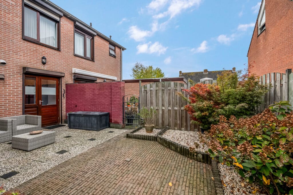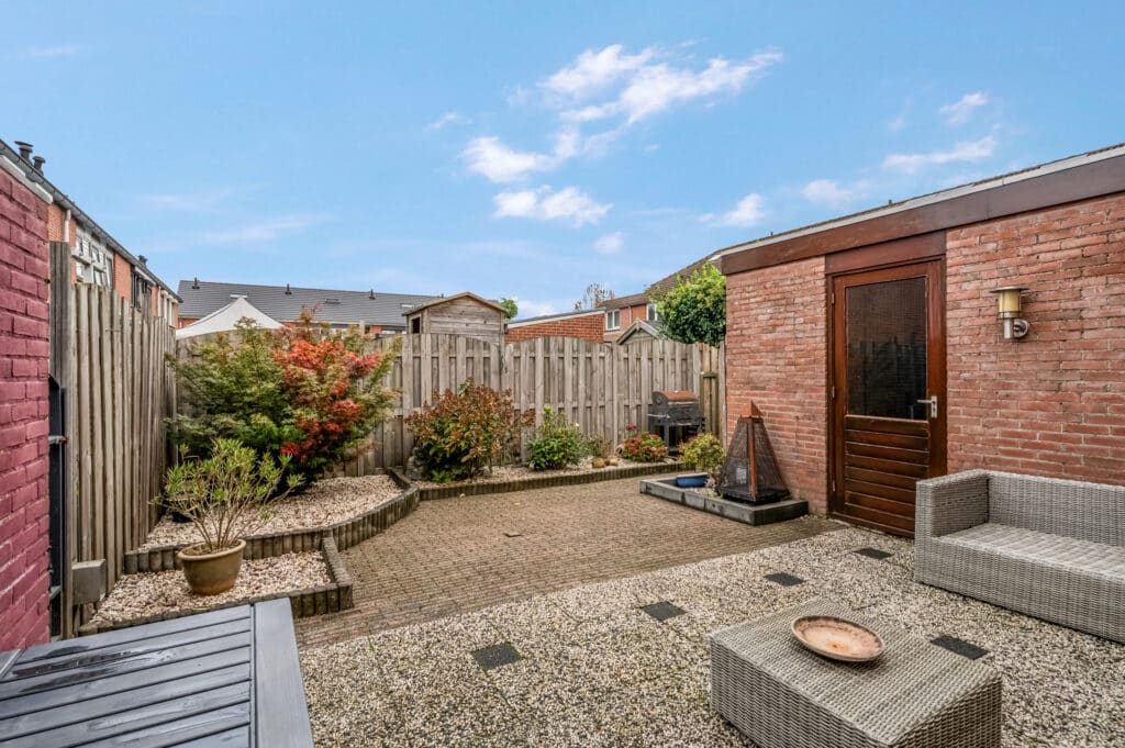 De tuin op het noord-westen is onderhoudsvrij en sfeervol aangelegd met een heerlijk terras en loungehoek, omringd door groenrijke border(s). Een tuin waar u veel vrijheid en privacy geniet en die via een achterom op eigen terrein bereikbaar is. Via de tuin kunt u de ruime garage betreden.