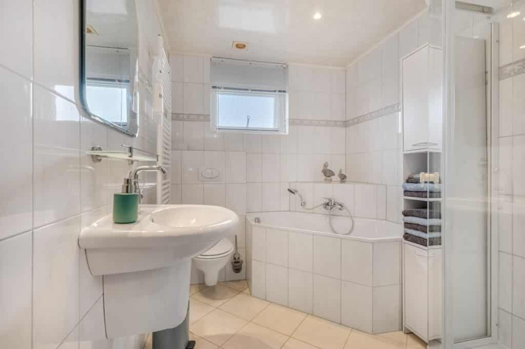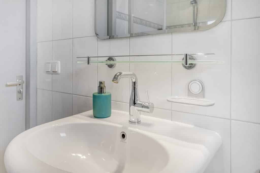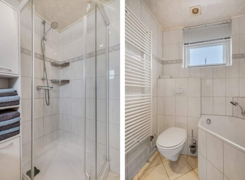 De sanitaire relaxruimte, ook wel badkamer genoemd, is praktisch ingericht en biedt exact wat u verwacht. Een badkamer met douchecabine, hoekbad, toilet, wastafel met spiegel en afgewerkt met een spanplafond met ingebouwde spots. De lichte betegeling maken deze ruimte licht en comfortabel.