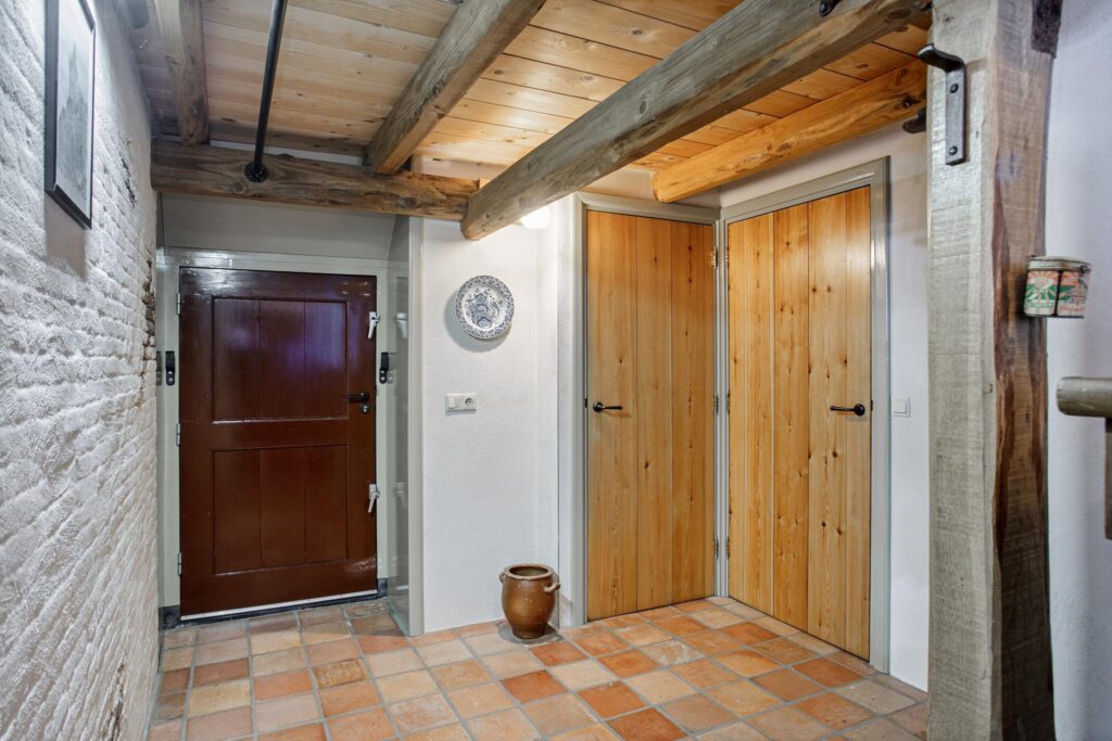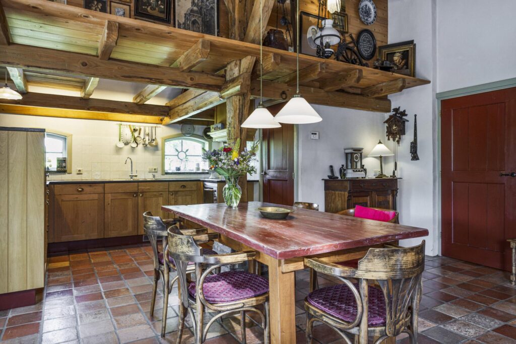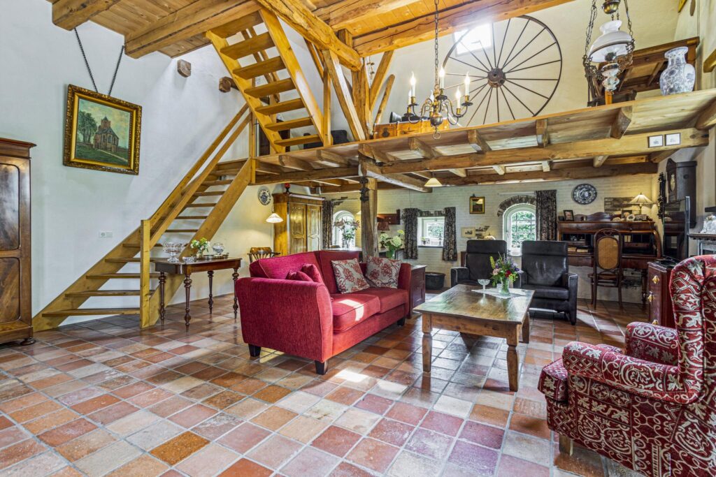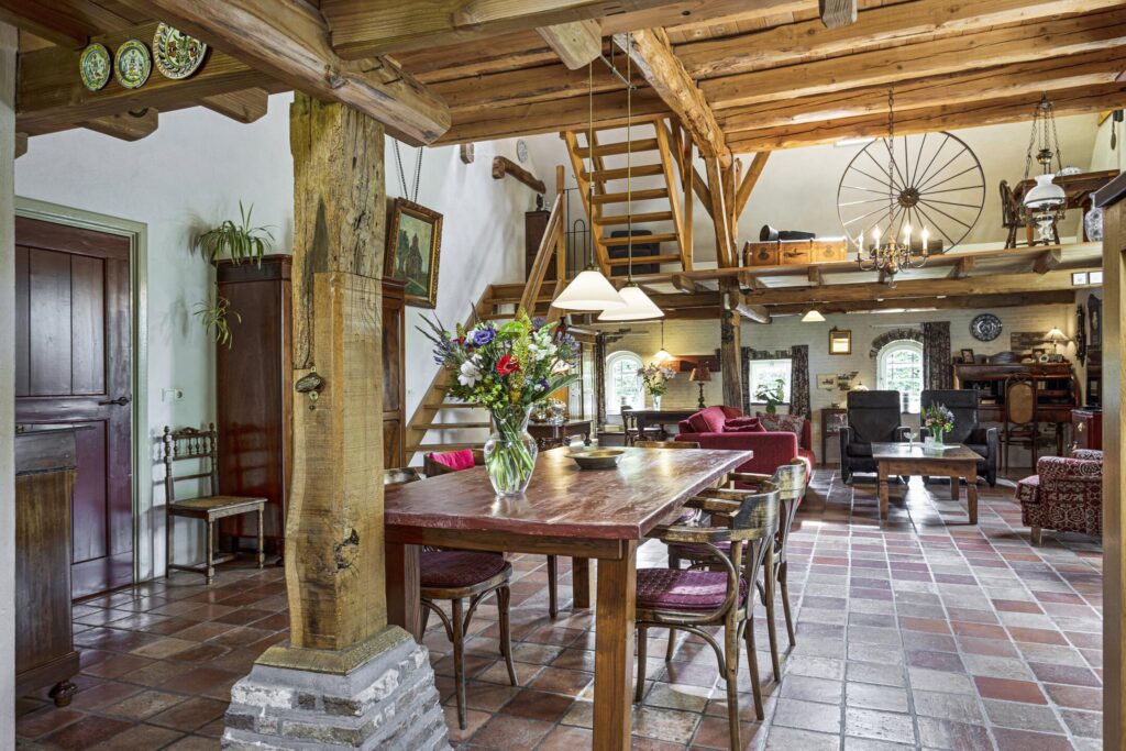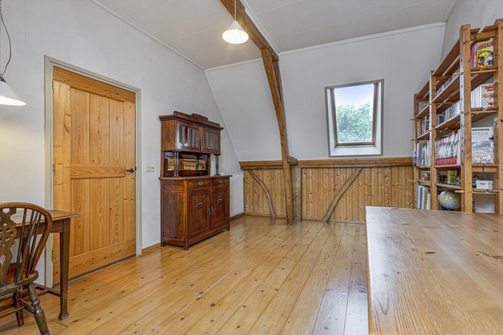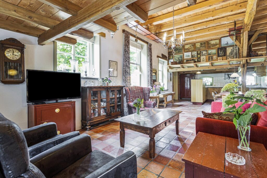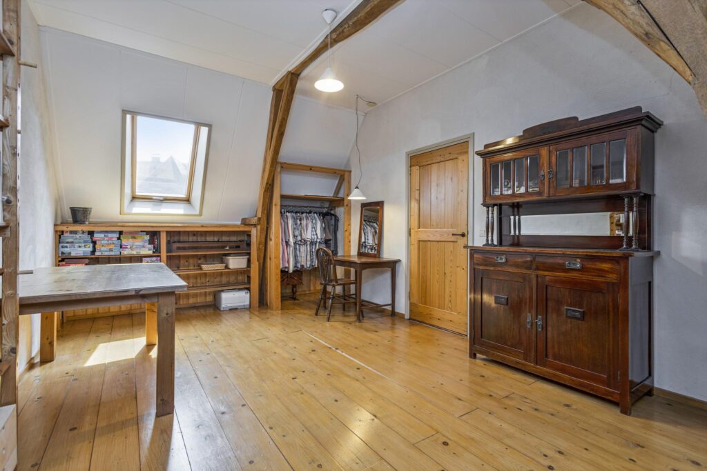 De woonkamer is een ware eyecatcher, met zijn imposante balkenplafond en royale afmetingen van ongeveer 68 m². Ondanks de grootte straalt de ruimte toch een knus en gezellig gevoel uit. Boven de hal bevindt zich een entresol, waar u onder andere de CV-ketel kunt vinden. Via de trap in de woonkamer bereikt u de entresol en de eerste verdieping van de woning. De entresolvloertjes, die vroeger dienden als hooizolders, voegen een speels element toe aan de indeling en creëren een gevoel van ruimtelijkheid. Hier komt het monumentale karakter van de woning opnieuw naar voren, met de prachtige zichtbare gebinten die een unieke sfeer scheppen.