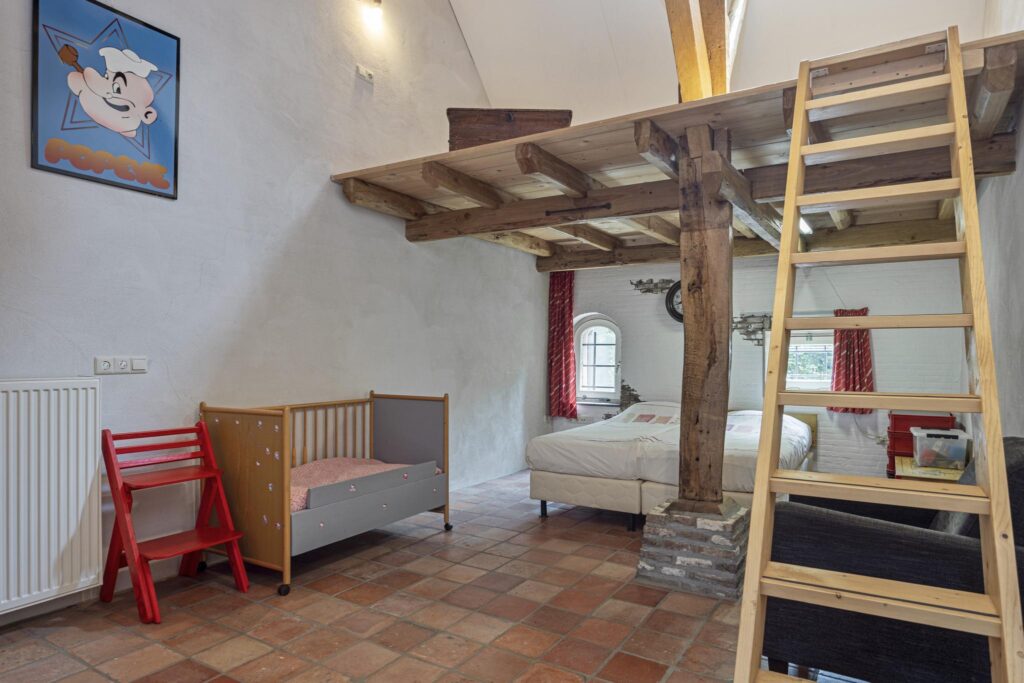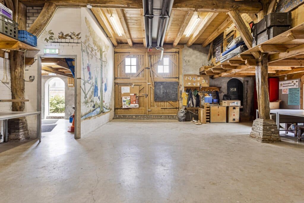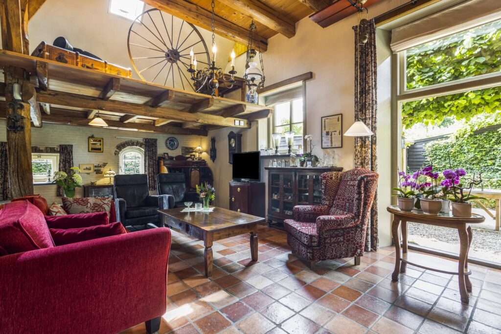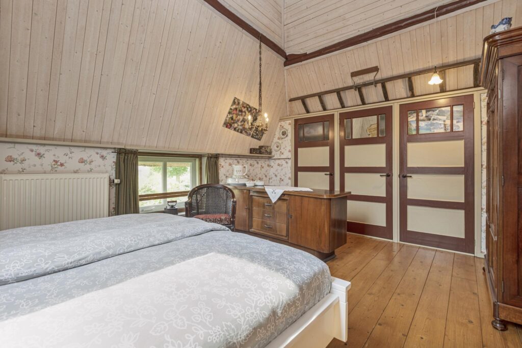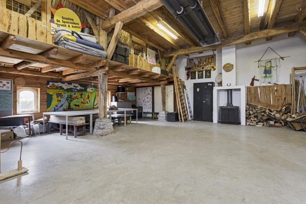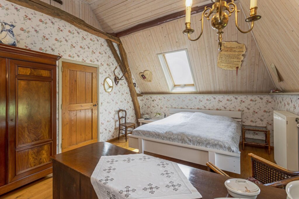 De woonkamer is een ware eyecatcher, met zijn imposante balkenplafond en royale afmetingen van ongeveer 68 m². Ondanks de grootte straalt de ruimte toch een knus en gezellig gevoel uit. Boven de hal bevindt zich een entresol, waar u onder andere de CV-ketel kunt vinden. Via de trap in de woonkamer bereikt u de entresol en de eerste verdieping van de woning. De entresolvloertjes, die vroeger dienden als hooizolders, voegen een speels element toe aan de indeling en creëren een gevoel van ruimtelijkheid. Hier komt het monumentale karakter van de woning opnieuw naar voren, met de prachtige zichtbare gebinten die een unieke sfeer scheppen.