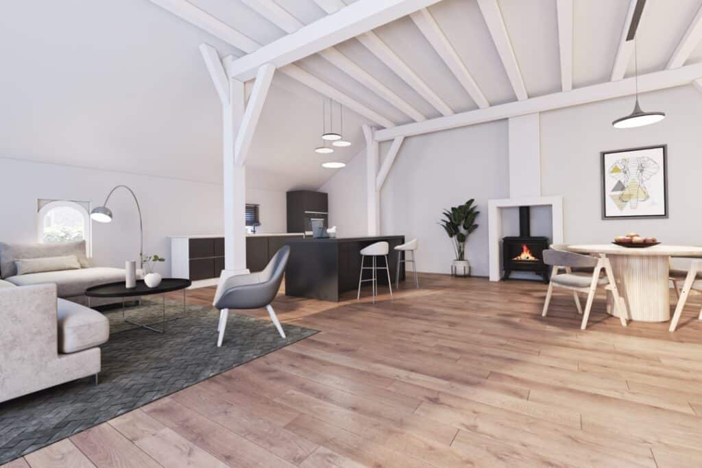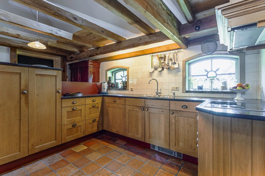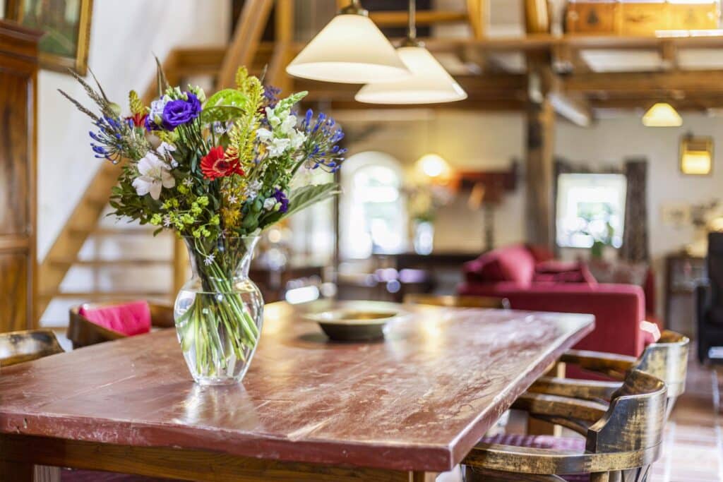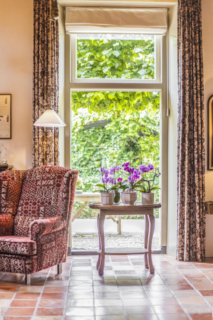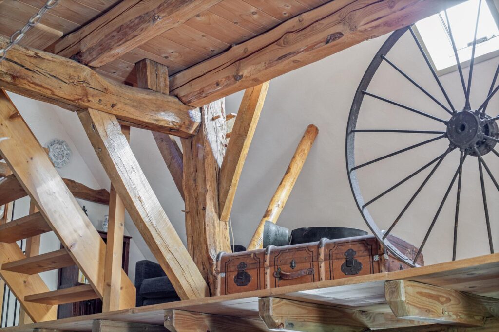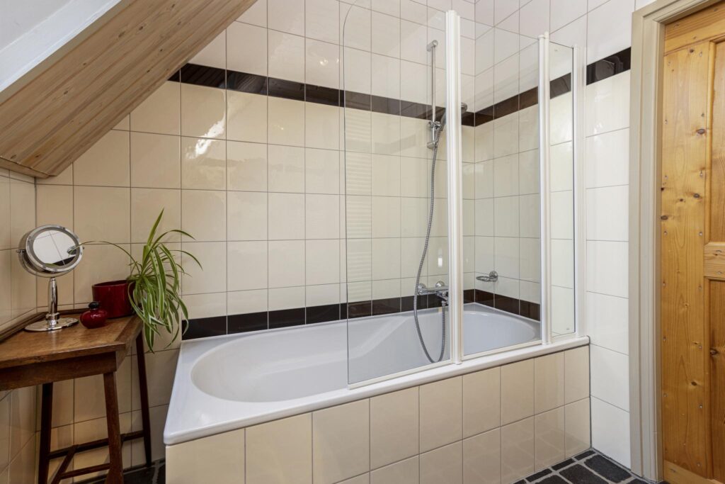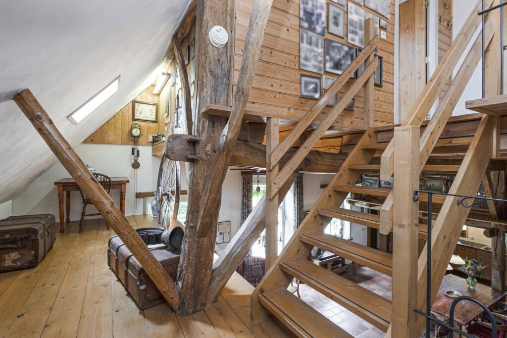 De woonkamer is een ware eyecatcher, met zijn imposante balkenplafond en royale afmetingen van ongeveer 68 m². Ondanks de grootte straalt de ruimte toch een knus en gezellig gevoel uit. Boven de hal bevindt zich een entresol, waar u onder andere de CV-ketel kunt vinden. Via de trap in de woonkamer bereikt u de entresol en de eerste verdieping van de woning. De entresolvloertjes, die vroeger dienden als hooizolders, voegen een speels element toe aan de indeling en creëren een gevoel van ruimtelijkheid. Hier komt het monumentale karakter van de woning opnieuw naar voren, met de prachtige zichtbare gebinten die een unieke sfeer scheppen.