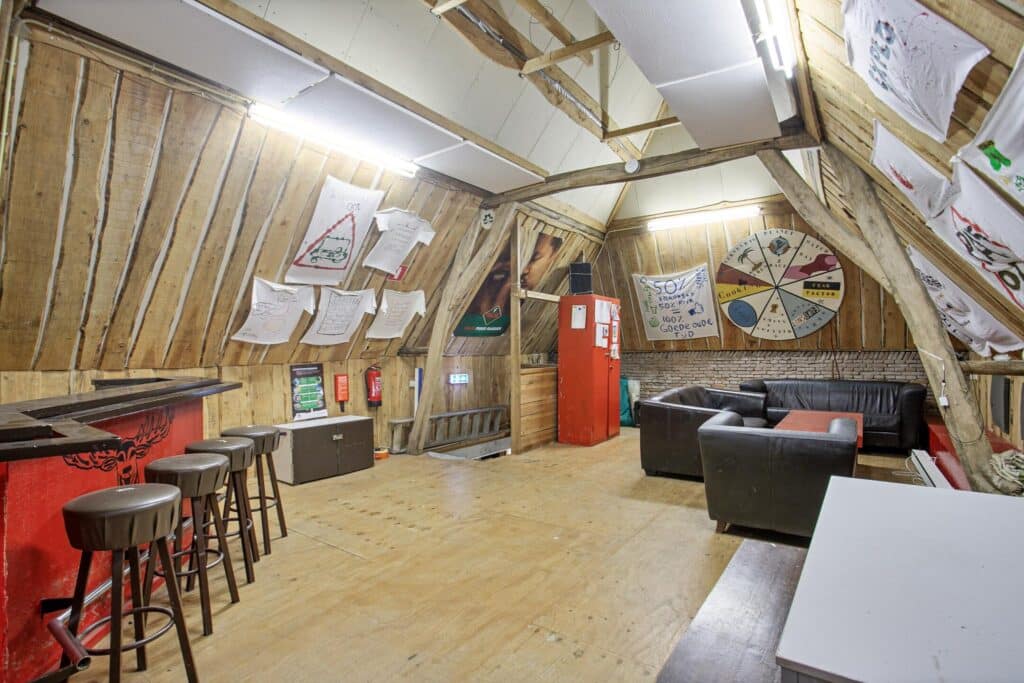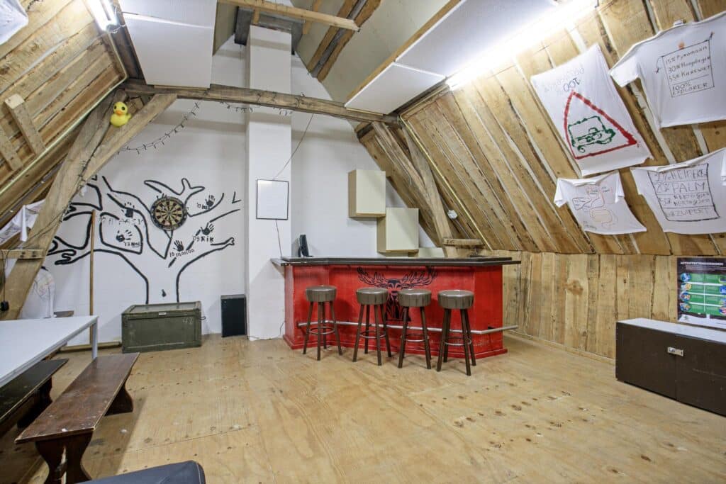 Via een vaste trap in de hal is de eerste verdieping bereikbaar. Deze verdieping fungeert momenteel als een ontmoetingsplek met een bar. In de toekomst zou deze ruimte goed kunnen dienen als slaapkamer of kantoor.