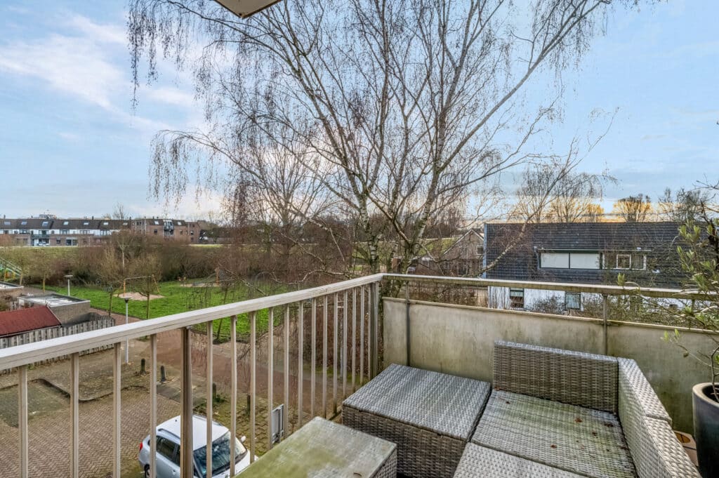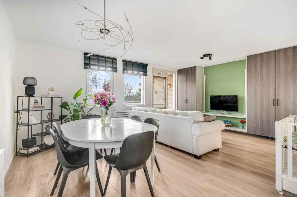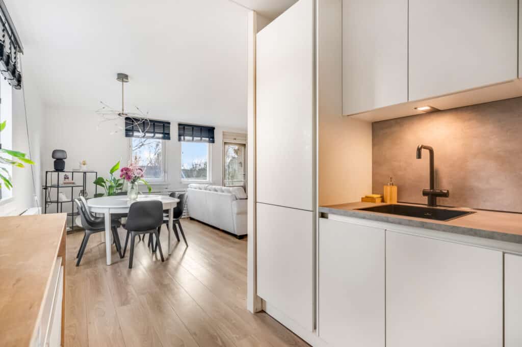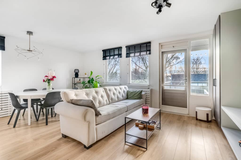 Bij binnenkomst valt meteen de frisse en moderne uitstraling op. Het appartement is strak afgewerkt met een warmkleurig laminaat door de gehele woning, glad gestucte wanden en keurig gespoten plafonds. De woonkamer met open keuken vormt het hart van het appartement: een heerlijke ruimte om te ontspannen, te leven en gasten te ontvangen. Via de woonkamer heb je direct toegang tot het zonnige balkon op het zuidoosten — ideaal voor een kop koffie in de ochtendzon of een gezellige borrel later op de dag.