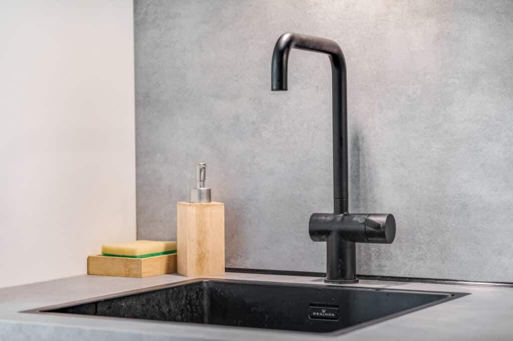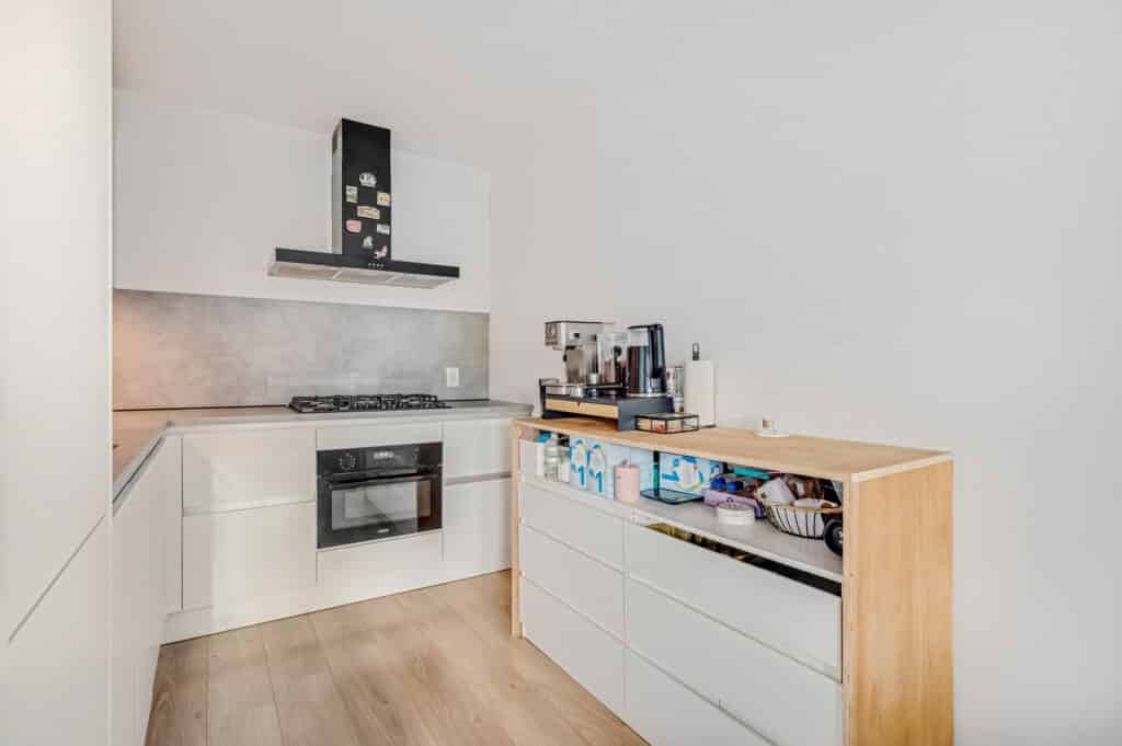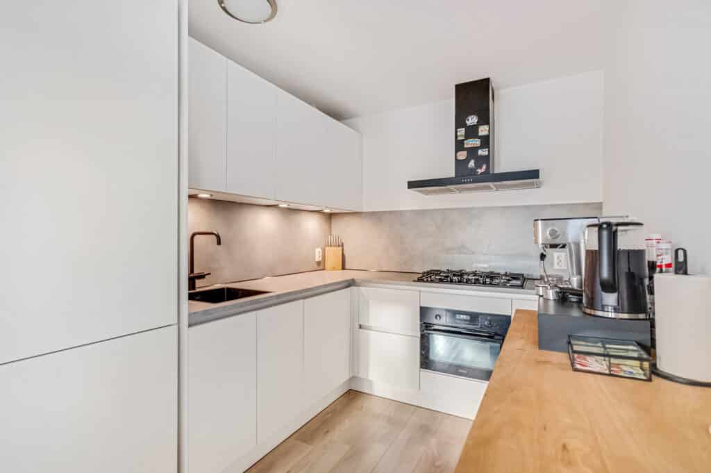 De open keuken (2022) is zowel functioneel als modern uitgevoerd. Je beschikt over een kunststof grijs werkblad, volop greeploze kastruimte en alle benodigde inbouwapparatuur: een koel-/vriescombinatie, vijfpits gasfornuis met combi oven, vaatwasser, ingebouwde spoelbak en voldoende stopcontacten. Of je nu snel iets klaarmaakt of uitgebreid kookt voor vrienden, hier wordt koken echt leuk. Een slim detail is de handige kruidenkast, waarmee de ruimte optimaal wordt benut.