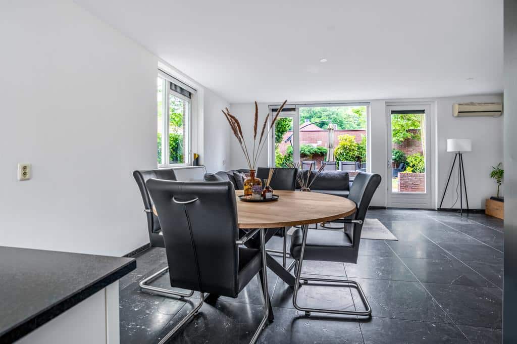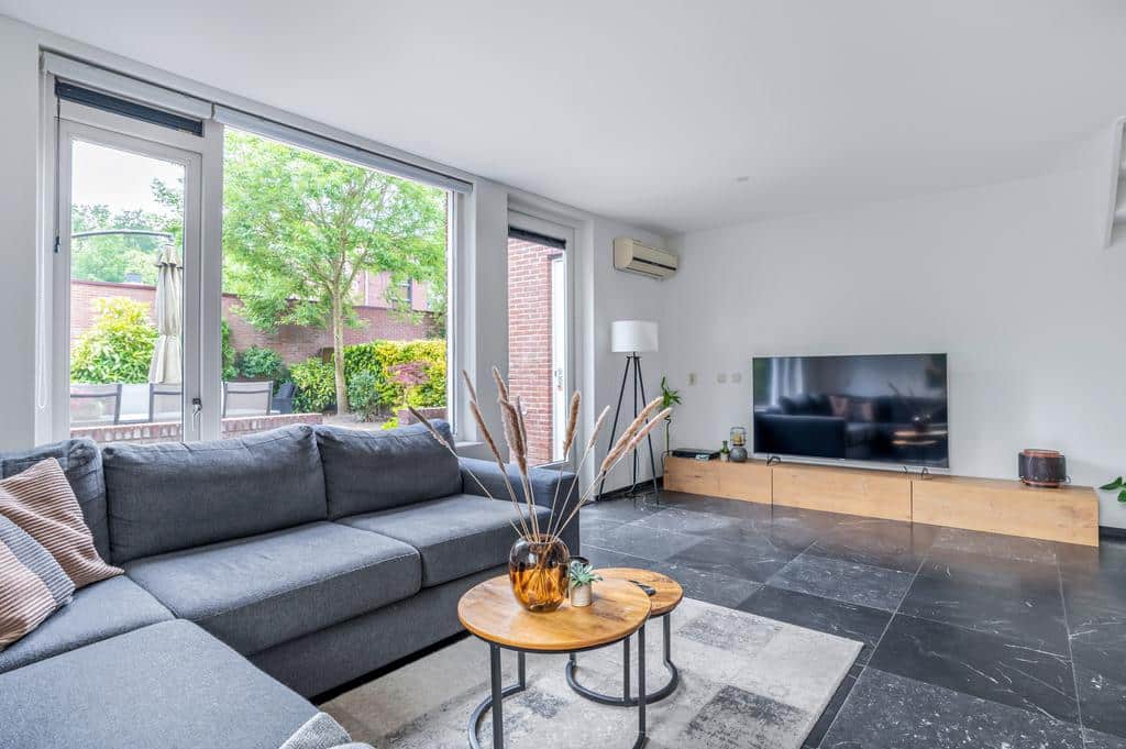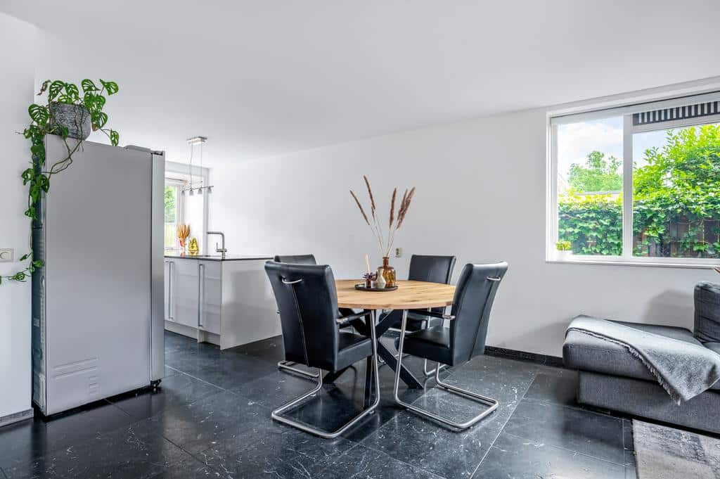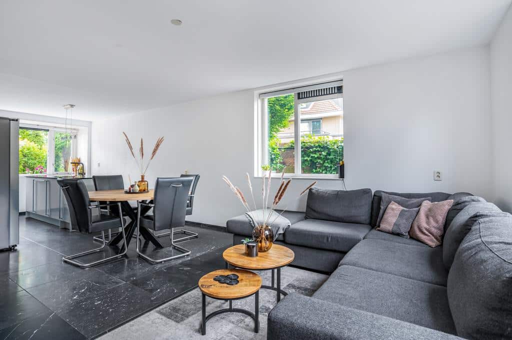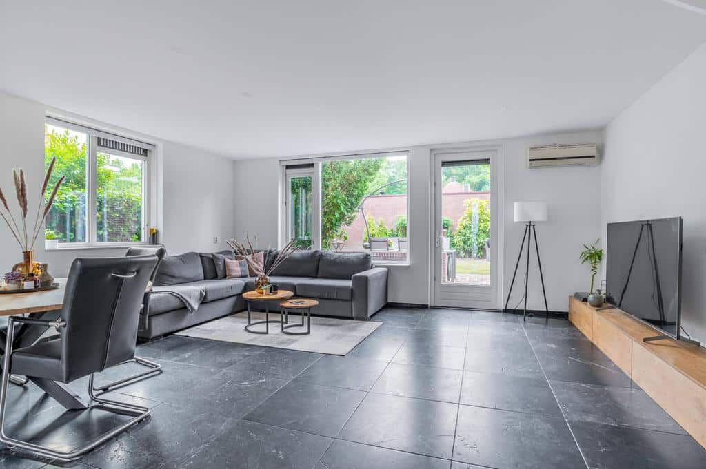 De woning heeft een sfeervolle en goede afwerking, wat je direct voelt als je binnen staat. De prachtige vloer met hoge plint en de neutrale kleurencombinaties op de wanden maken het tot een sfeervol geheel. De ruime woonkamer is tuingericht en biedt voldoende ruimte voor een zithoek in combinatie met een eettafel. Mocht u het woongedeelte nog uit willen breiden zijn de voorbereidingen hiervoor al getroffen. De fundering voor een eventuele uitbouw is al gerealiseerd. Vanuit de living is er een breed uitzicht over de besloten achtertuin. Met de openslaande deur is het terras direct toegankelijk, wat de woning optisch nog ruimtelijker maakt. Het aircosysteem houdt het hier lekker koel tijdens de warme zomermaanden.