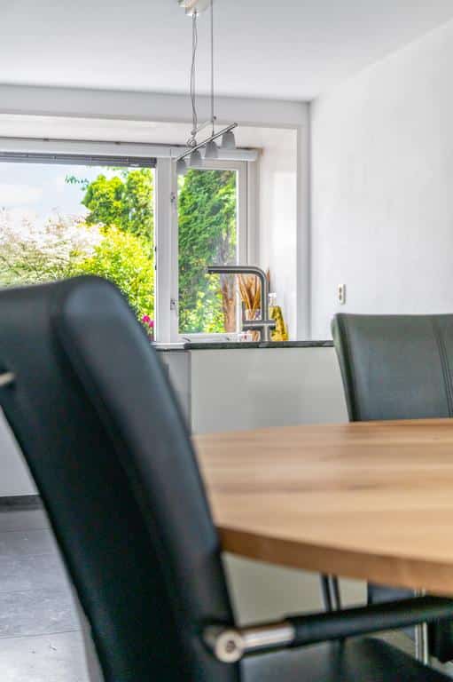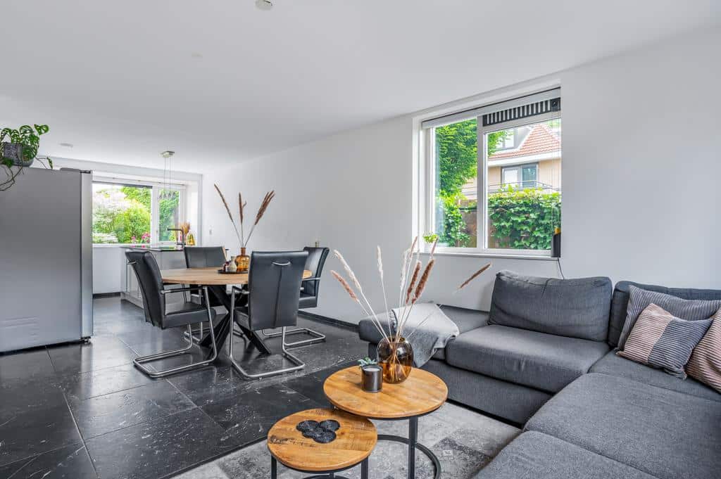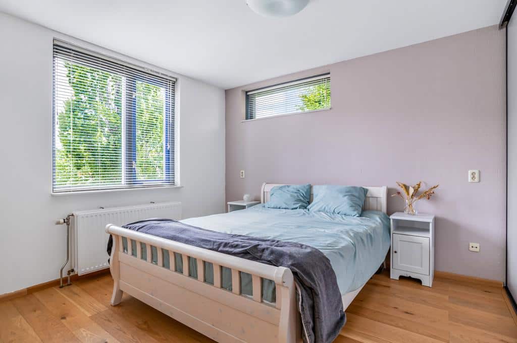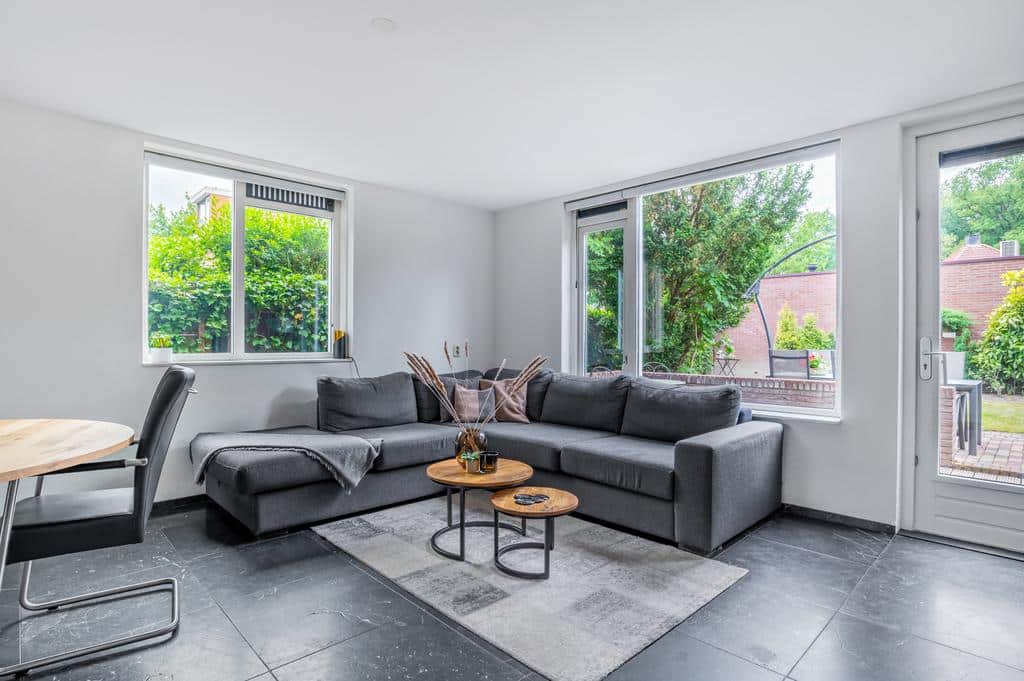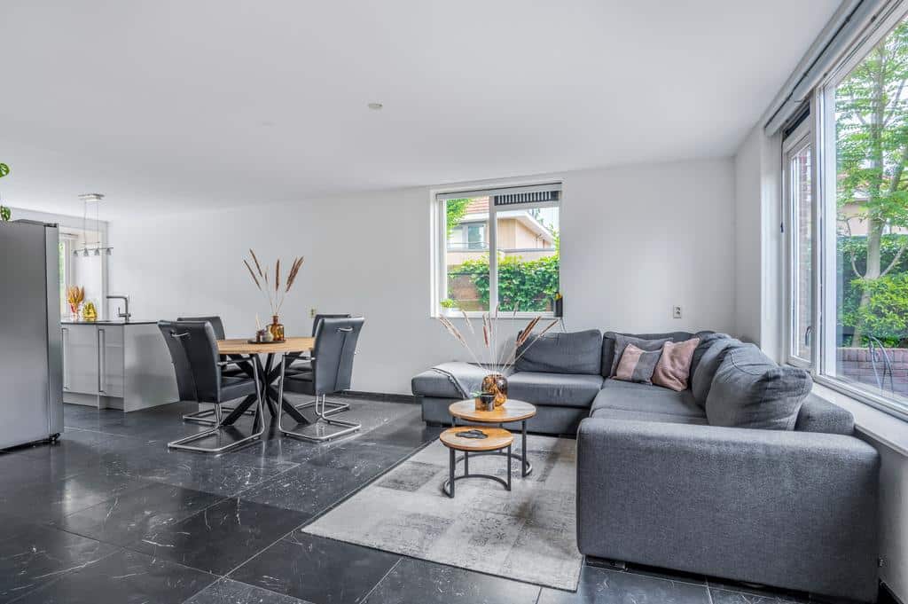De woning heeft een sfeervolle en goede afwerking, wat je direct voelt als je binnen staat. De prachtige vloer met hoge plint en de neutrale kleurencombinaties op de wanden maken het tot een sfeervol geheel. De ruime woonkamer is tuingericht en biedt voldoende ruimte voor een zithoek in combinatie met een eettafel. Mocht u het woongedeelte nog uit willen breiden zijn de voorbereidingen hiervoor al getroffen. De fundering voor een eventuele uitbouw is al gerealiseerd. Vanuit de living is er een breed uitzicht over de besloten achtertuin. Met de openslaande deur is het terras direct toegankelijk, wat de woning optisch nog ruimtelijker maakt. Het aircosysteem houdt het hier lekker koel tijdens de warme zomermaanden.