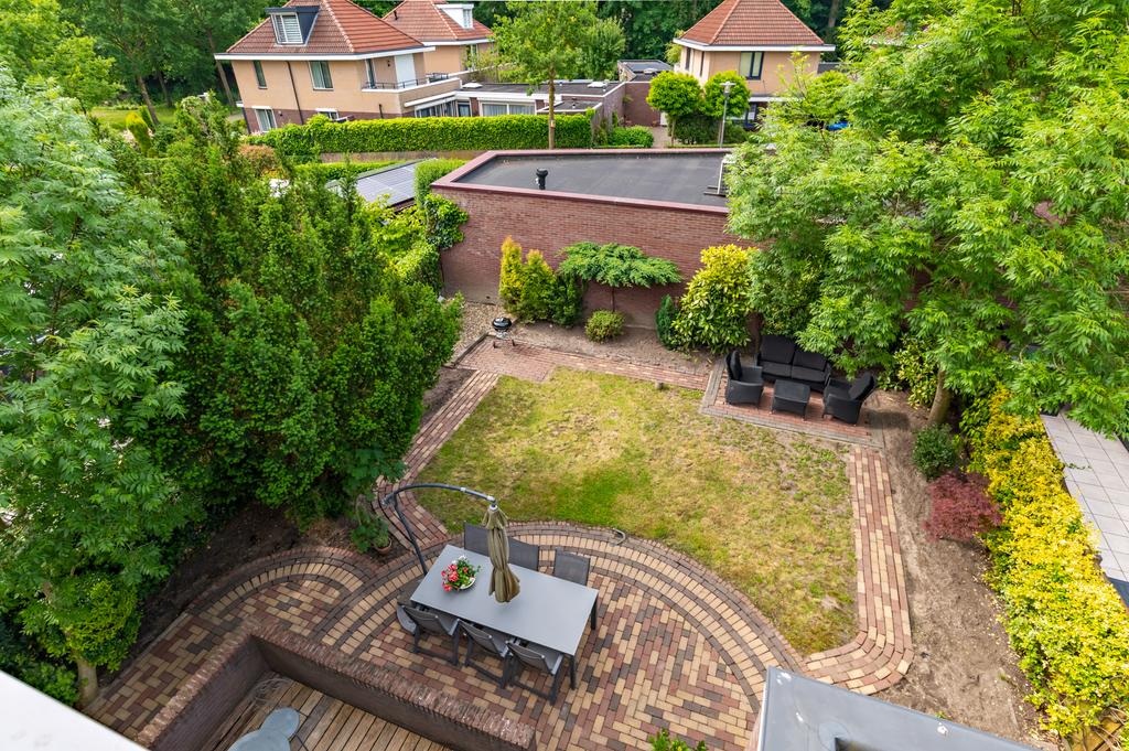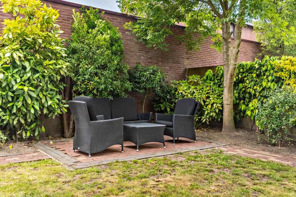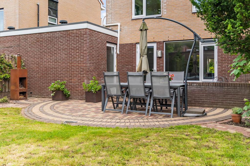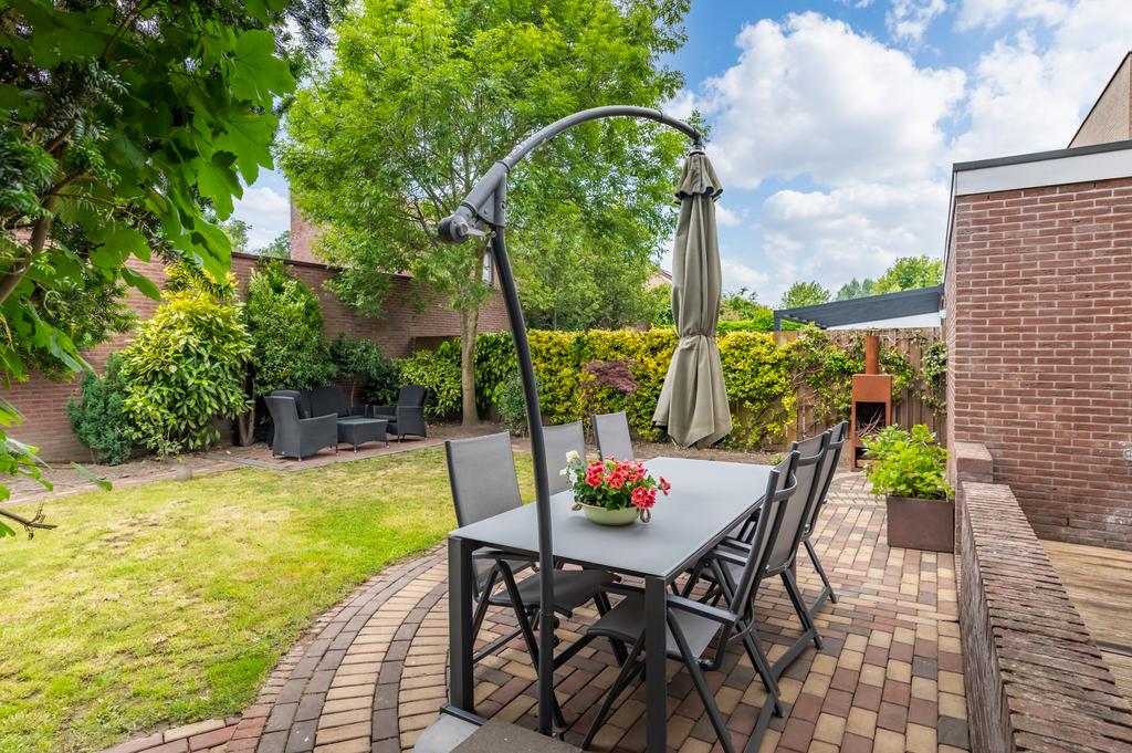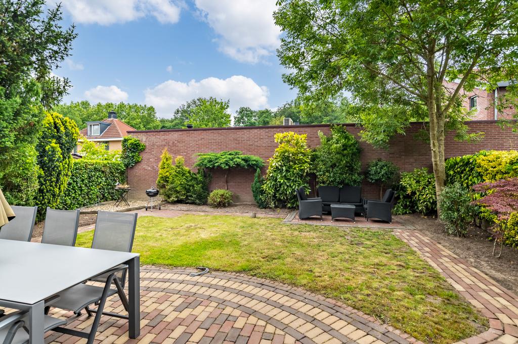 De riante achtertuin heeft, net als de woning, een goed onderhouden uitstraling. Een speelse tuin met verschillende terrassen, groenrijke borders, gazon, bomen en struiken, toegang tot de praktijkruimte en ideale achterom. Het terras is direct aan de woning, over de volledige breedte, gerealiseerd. Hier is voldoende ruimte om een heerlijke eettafel neer te zetten. Via de openslaande deur loop je zo deze zonnige tuin in die het woongenot compleet maakt. Verder zijn er meerdere mogelijkheden voor een extra terras en/of loungehoek waardoor u altijd de gelegenheid heeft om voor schaduw of zon te kiezen.