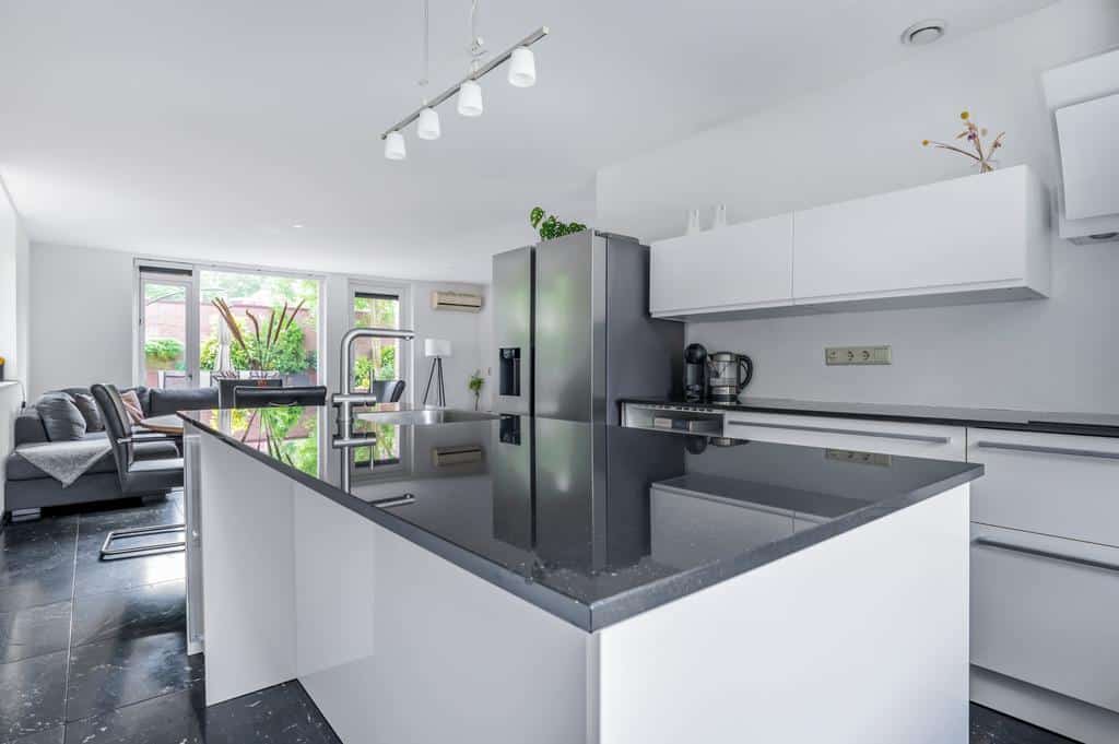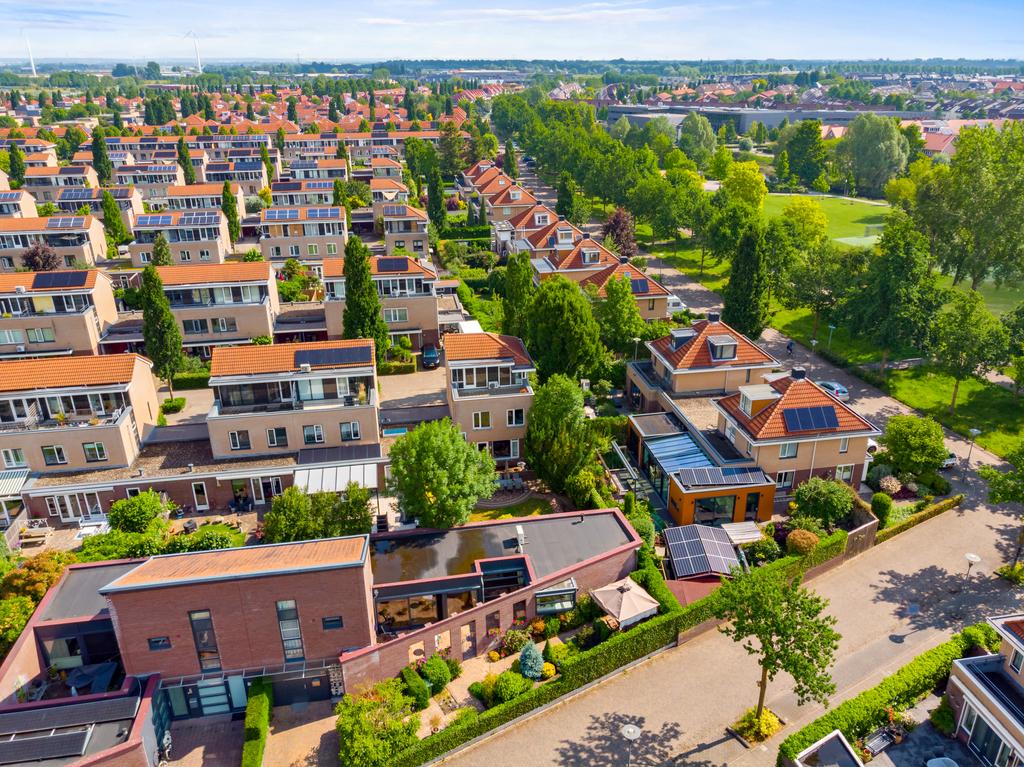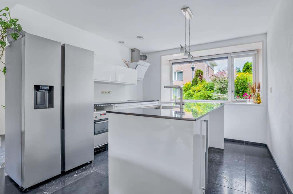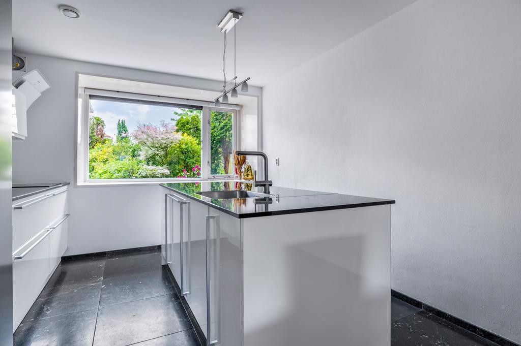 De open keuken is met een kookeiland en in lichte tinten opgesteld. Deze keuken is zeker niet standaard te noemen. Met name de werk- en kastruimte in combinatie het vele lichtinval en het donkere composieten blad maken het tot één geheel. De opstelling bevat daarbij diverse inbouwapparatuur zoals een inductie kookplaat met design afzuigkap, vaatwasser, combi oven, spoelbak op het eiland en een grote koel/vriescombinatie die naar wens achterblijft. Deze ruimte valt onder een veelzijdig gedeelte van de woning. Afgewerkt met voldoende kastruimte en een diep werkblad. Door de diepte van de vensterbank aan de voorzijde is ook hier nog extra werkruimte te realiseren. Een opvallend detail aan deze woning is de rustgevendheid aan de voorzijde. Een kindvriendelijke en verkeersluwe straat en dat in combinatie met het groen- en waterrijke park op loopafstand. Vanuit de keuken heeft u een breed zicht op de straat en de fraai ingerichte voortuin.