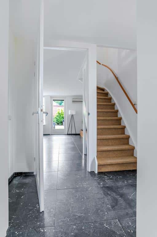 Bij binnenkomst valt je oog direct op het grote natuurstenen tegelwerk met hoog plintwerk en vloerverwarming die over de gehele begane grond is doorgetrokken. De statige hal is ingericht met een moderne meterkast (8 groepen, 2 aardlekschakelaars), betegeld toilet met fontein en de trapopgang naar de verdieping.