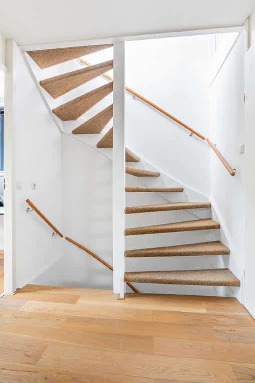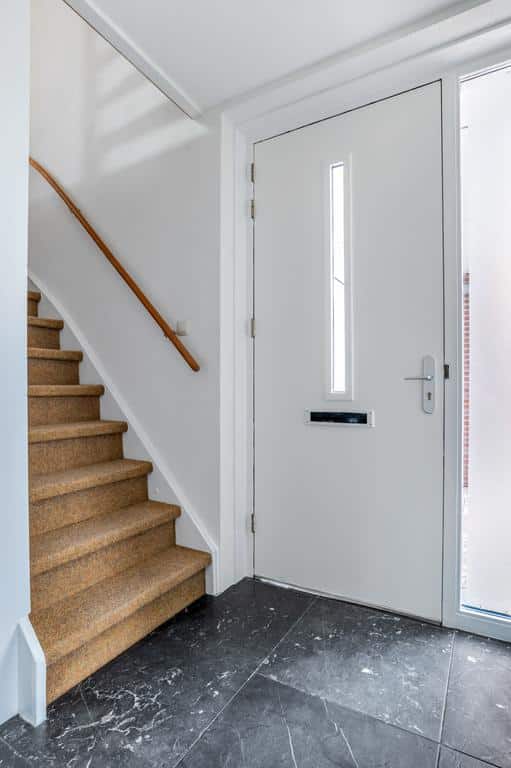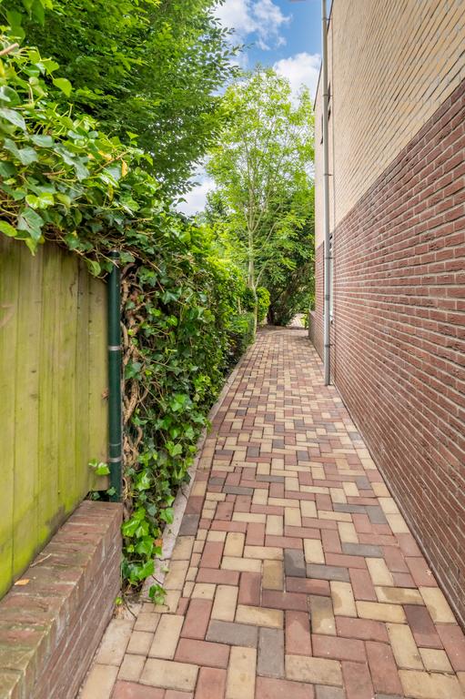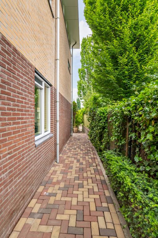 Wanneer we de auto voor de garage hebben geparkeerd valt ons oog direct op de architectuur van deze woning. Opgetrokken met een mooie steen en grote raampartijen op elke verdieping. Deze woning is in stijl opgebouwd.