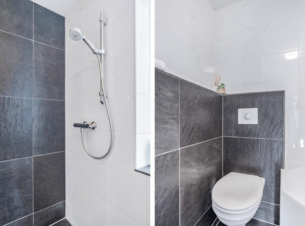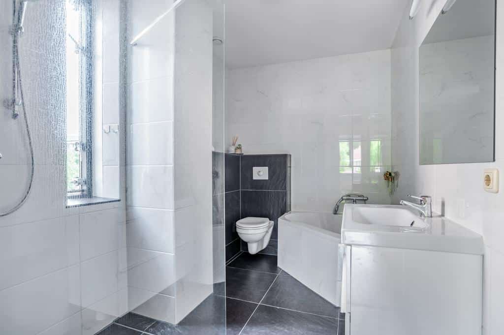 Op de eerste verdieping vinden we een nette en praktische badkamer die is voorzien van een hoekbad, ruime douchecabine, badkamermeubel met wastafel en spiegel en toilet. De badkamer is geheel modern betegeld tegel. Mechanische en natuurlijke ventilatie verzorgen de afzuiging.