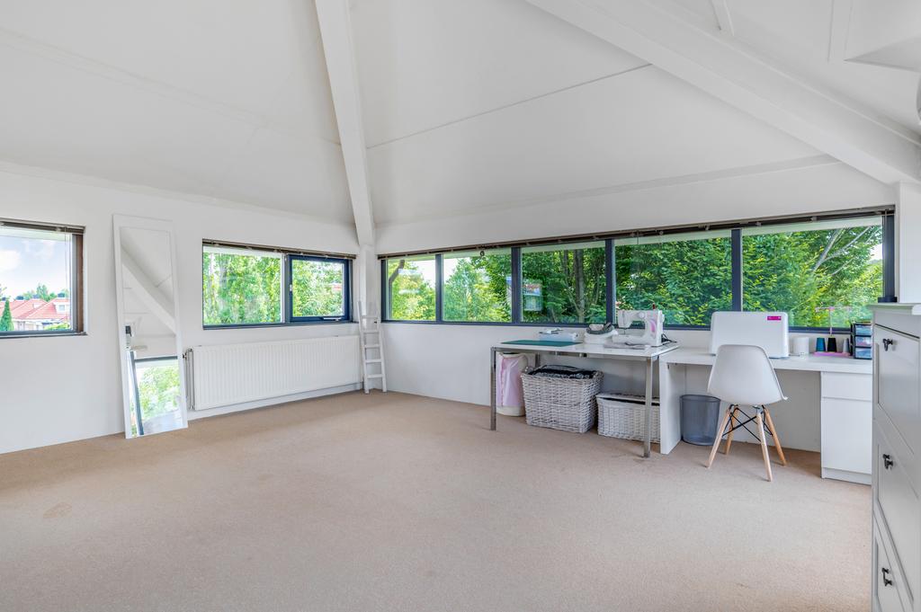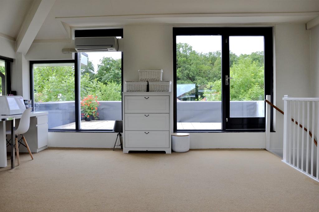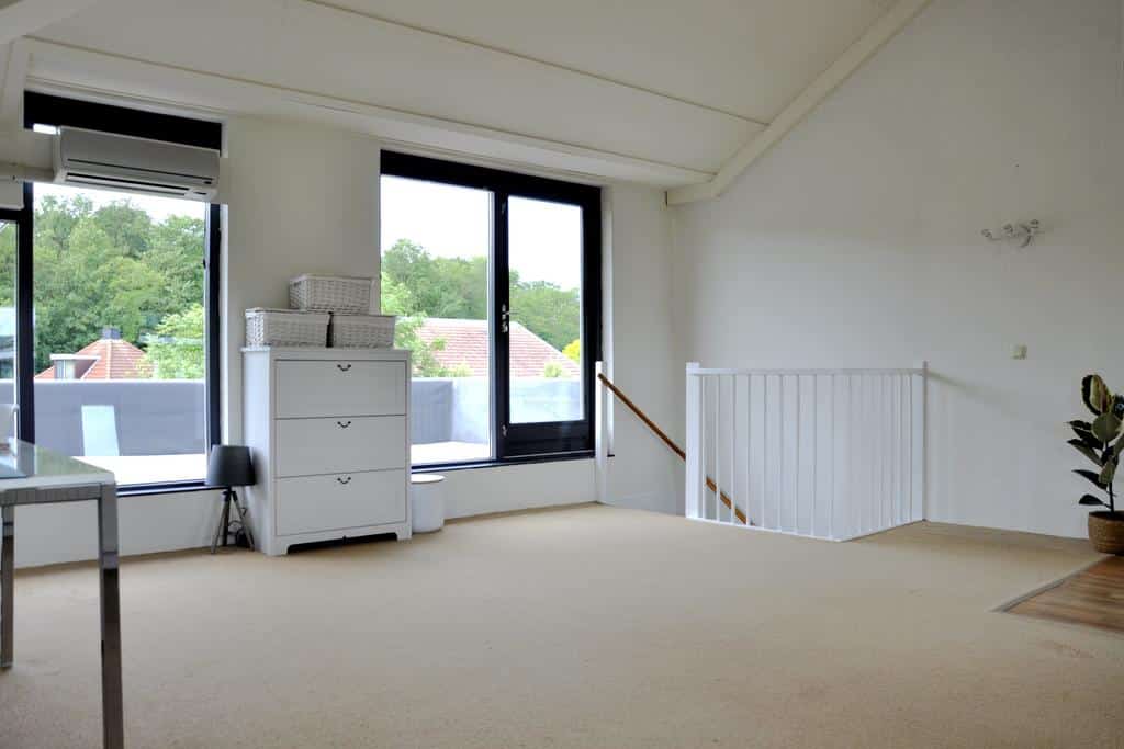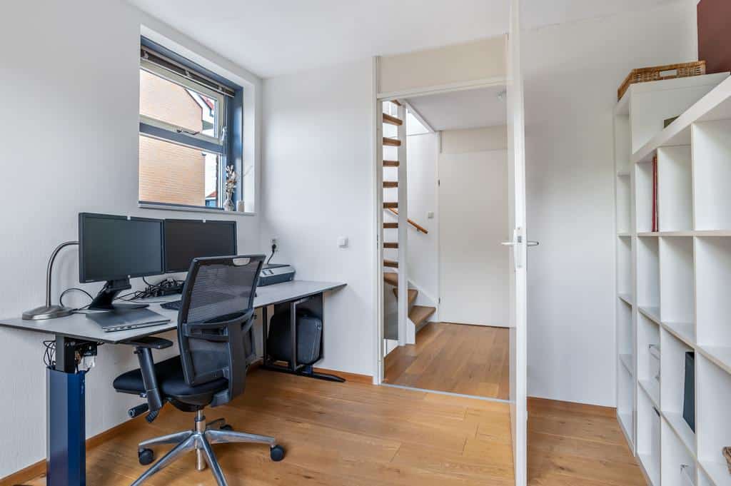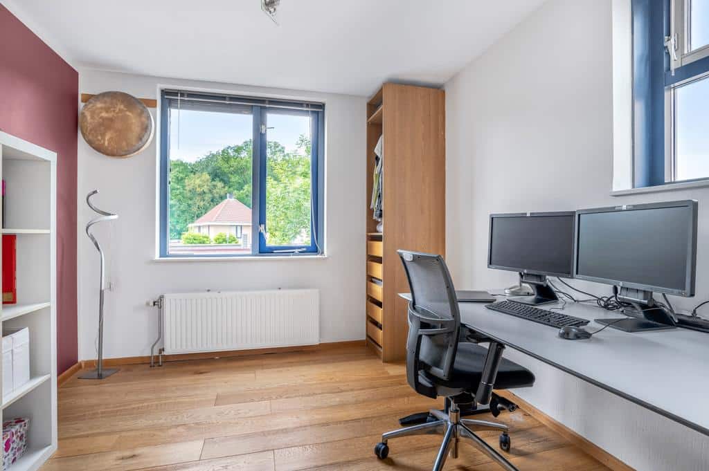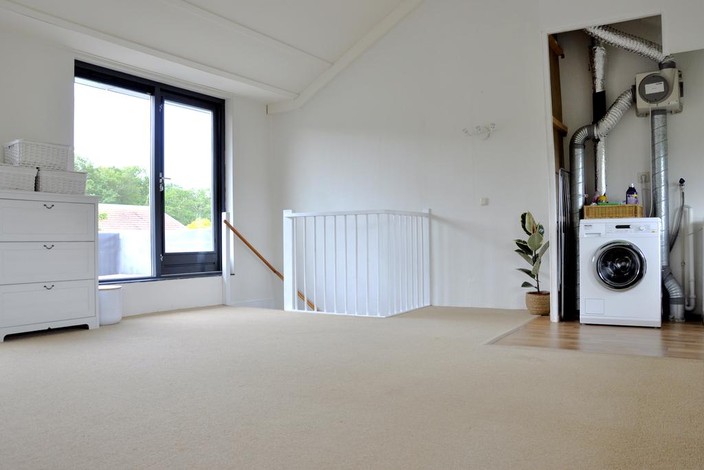 De tweede verdieping is absoluut een meerwaarde voor deze woning. Een verrassende en zeer volwaardige woonlaag afgewerkt met vloerbedekking. Momenteel ingericht als één volledige ruimte met kantoor/werkplek en een afgezonderde hoek voor wasmachine/droger en de mechanische ventilatie. Ideaal in deze tijden waar thuis werken de trend aan het worden is. Door wederom veel raampartijen in de achtergevel en een grote kamerhoge pui met dubbele openslaande deuren in de achtergevel bezit ook deze verdieping enorm veel licht. Erg fijn als je hier bijvoorbeeld slaapkamer(s) zou willen realiseren of een slaapkamer met kantoor/werkruimte. Door de riante afmetingen zijn hier voldoende mogelijkheden. Daarnaast zou je door de hoge bouw ook nog een compacte vliering of entresol kunnen realiseren voor extra opslagruimte.