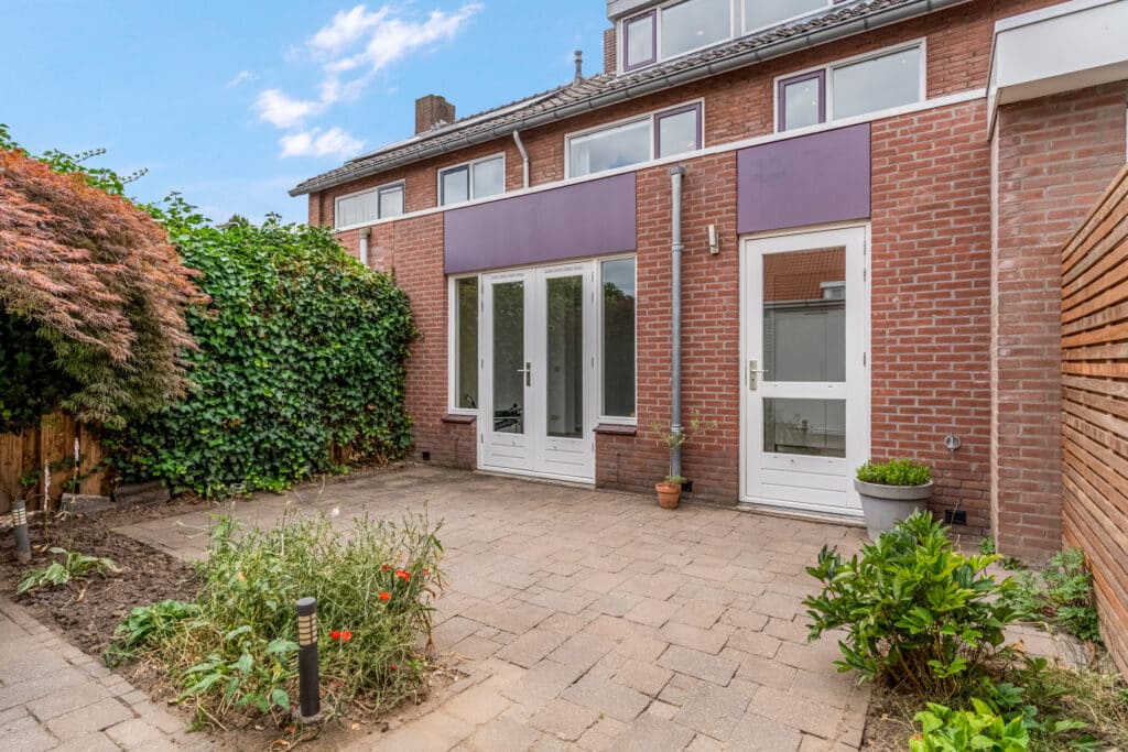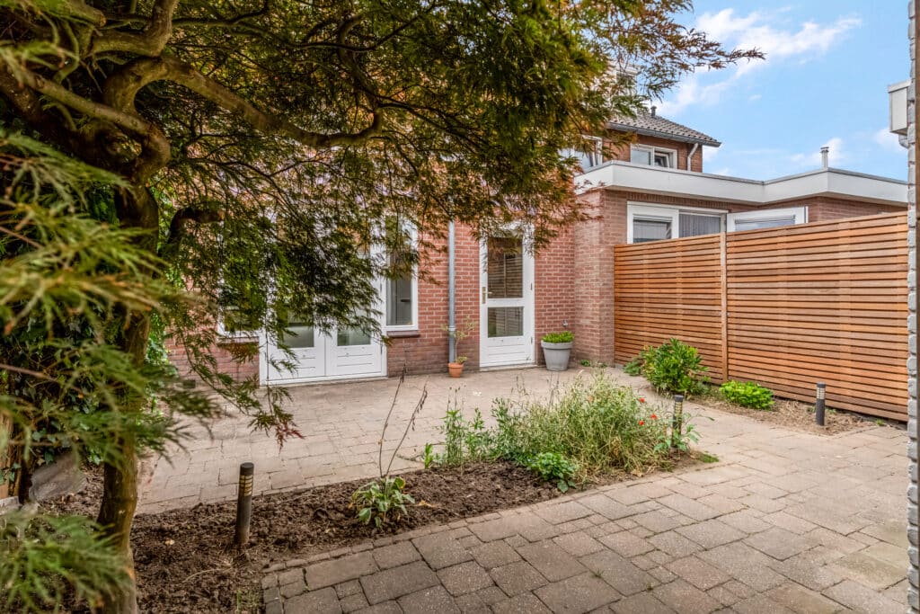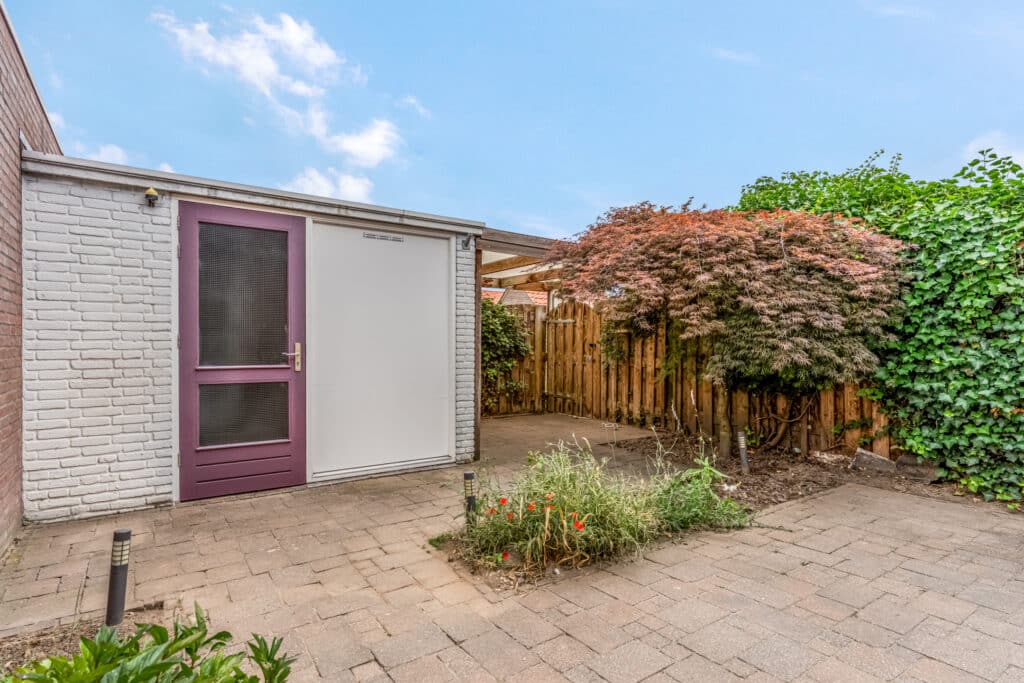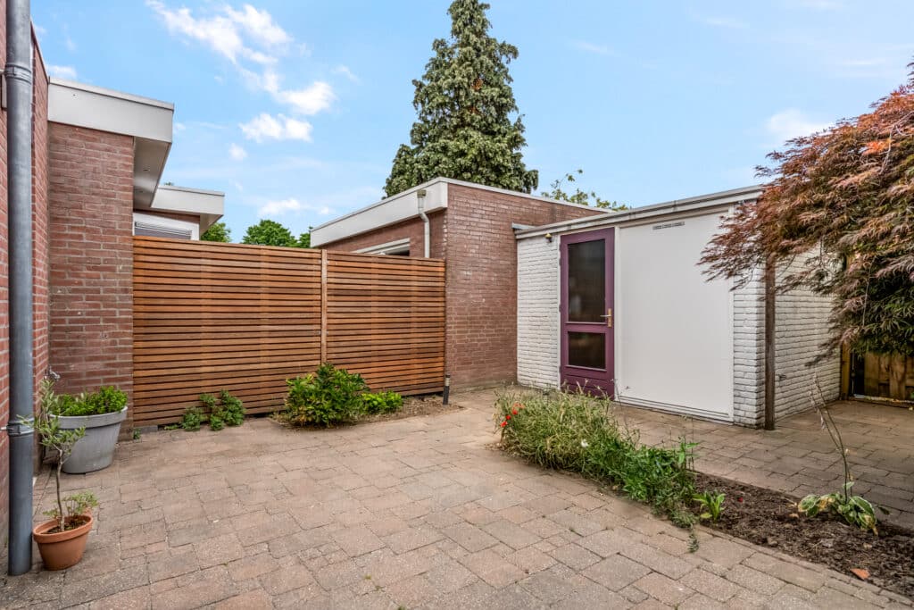 De besloten achtertuin is sfeervol aangelegd met speels straatwerk, mooie borders en volwassen beplanting. Hier geniet je in alle rust van het buitenleven! Achterin bevindt zich een stenen berging met overkapping en een praktische achterom.