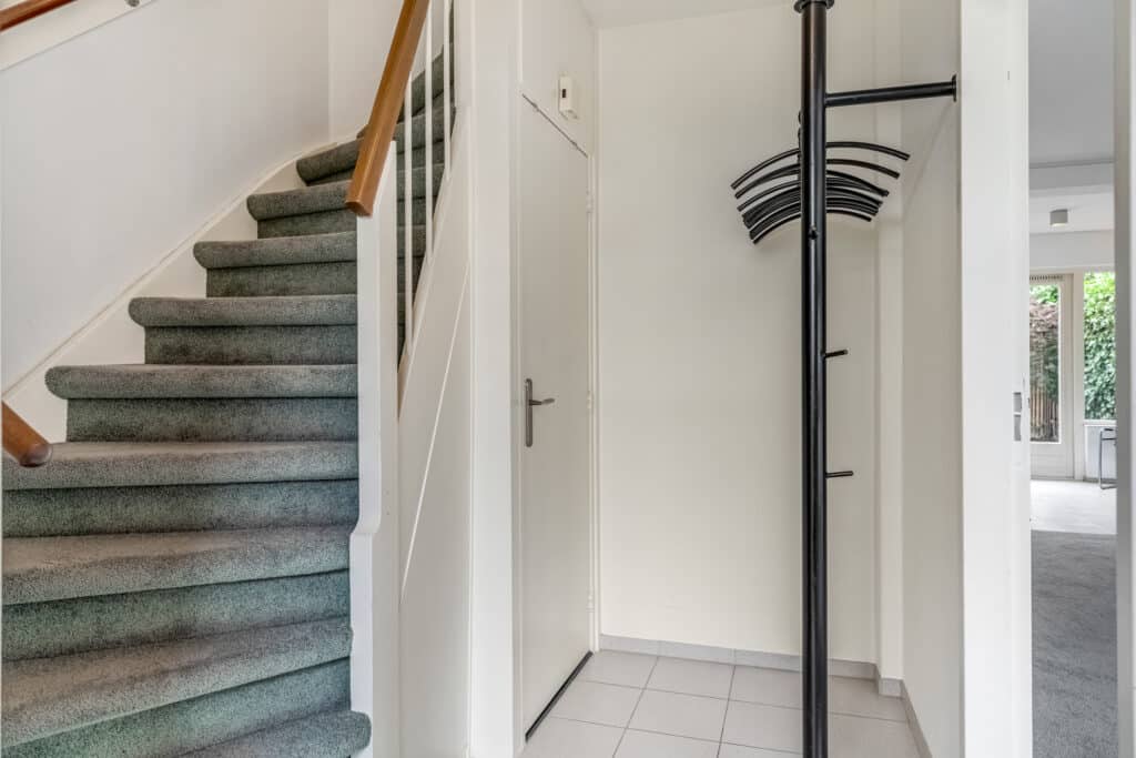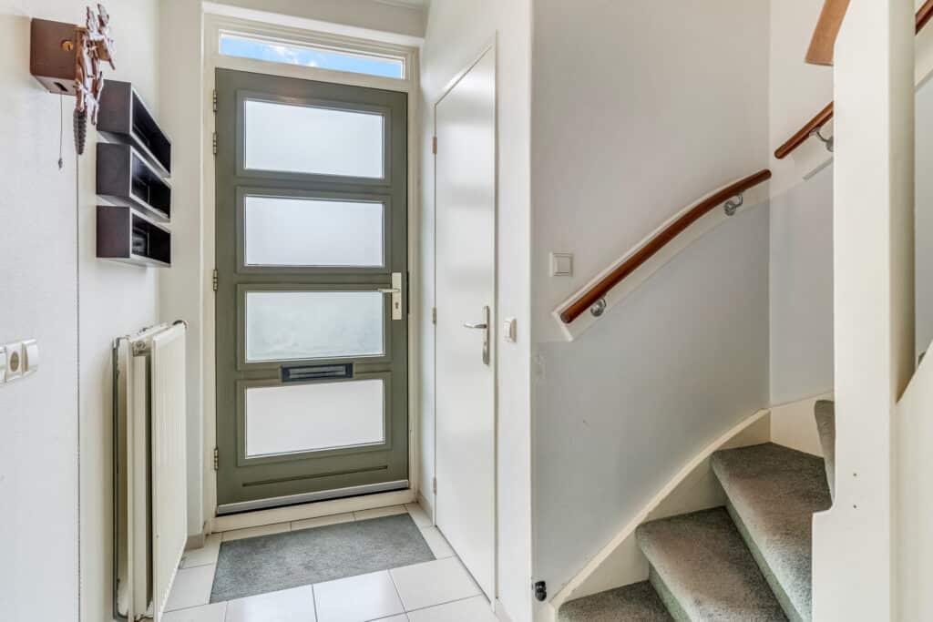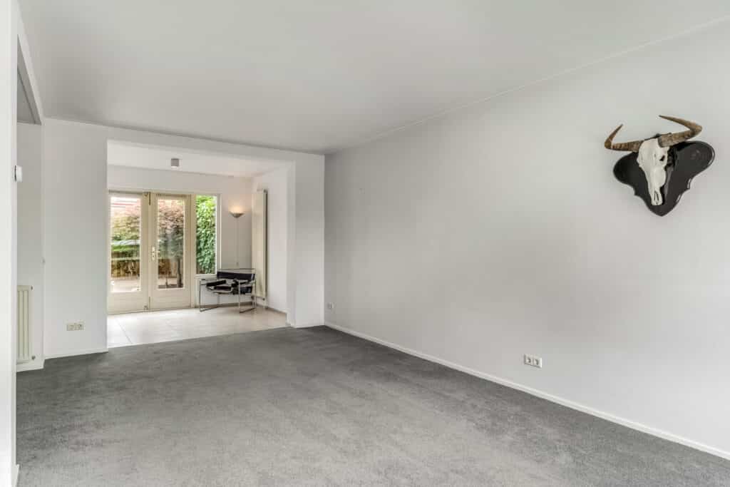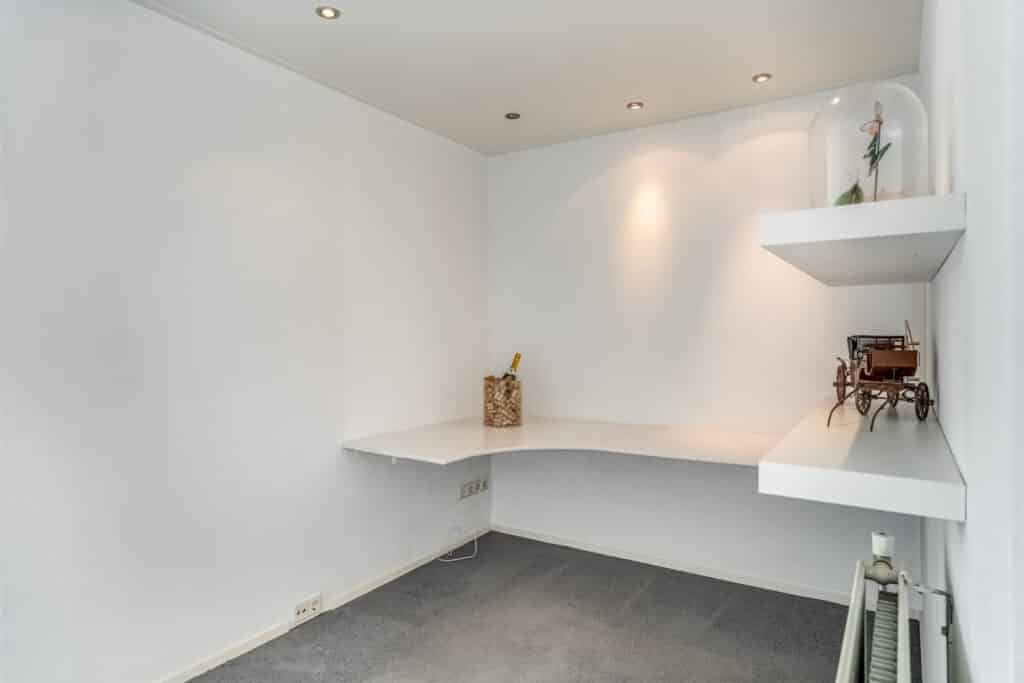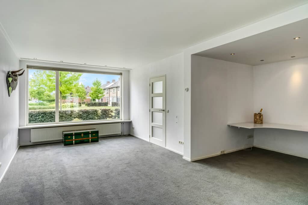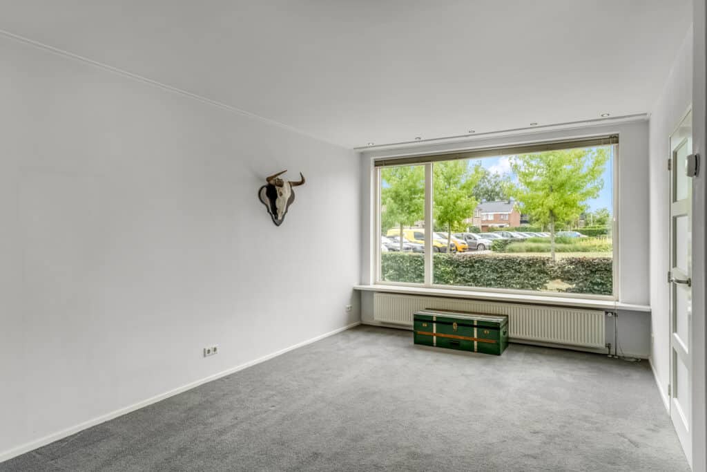 Via de nette, betegelde hal met garderobehoek, kelderkast (met moderne meters), kruipruimte en keurig toilet, stap je de uitgebouwde, lichte doorzonwoonkamer binnen. Dankzij de grote raampartijen met HR-glas geniet je hier van een fijne lichtinval. Luxaflex voor de ramen (gehele woning) zorgt voor de nodige privacy. De houten vloer is netjes afgewerkt met vloerbedekking en er zijn voldoende stopcontacten aanwezig. In het midden is een prettige kantoor-/werkhoek gecreëerd, ideaal voor thuiswerken of studeren. De afwerking met inbouwspots zorgt voor een moderne en sfeervolle uitstraling. Aan de voorzijde is een elektrisch screen aanwezig.