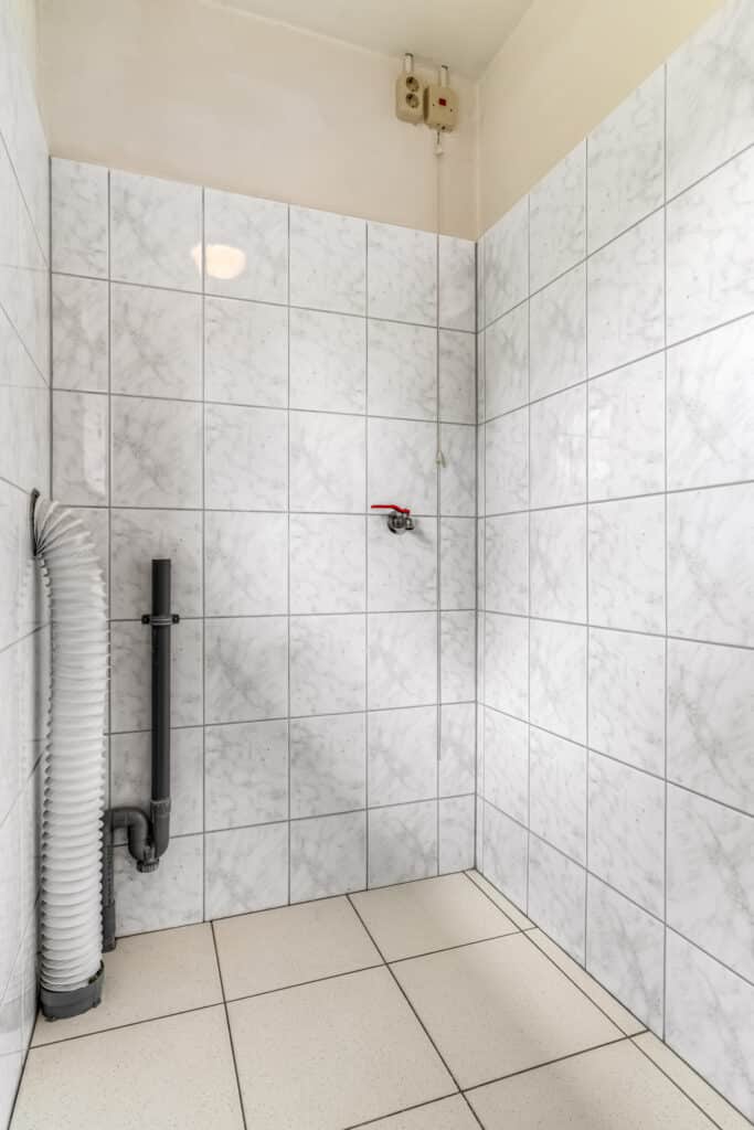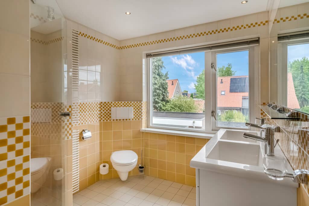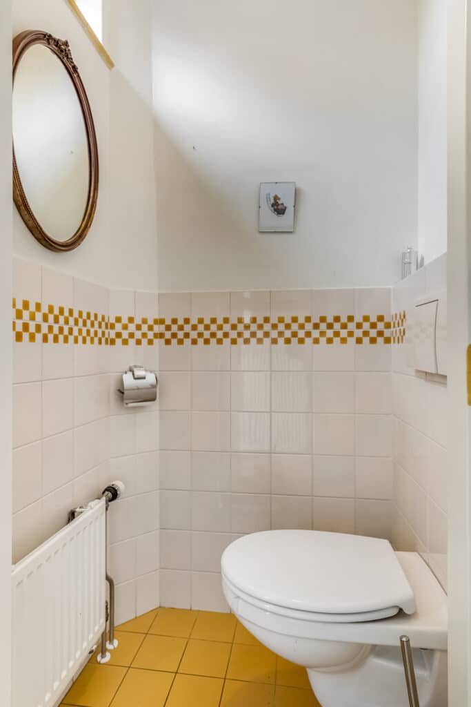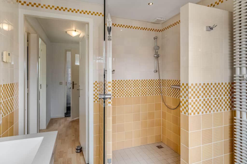 De ruime en volledig betegelde badkamer is praktisch én stijlvol. Hier vind je een wasmeubel met dubbele spoelbak, een ruime inloopdouche, een tweede toilet, een designradiator en vloerverwarming. De afwerking met spots zorgt voor een moderne uitstraling.