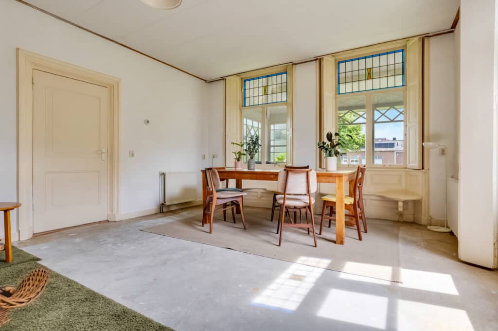 Deze sfeervolle benedenwoning vormt het gezicht van de woonboerderij en is direct zichtbaar vanaf het Wilhelminaplein. De woning ademt karakter, met onder meer een lichte serre aan de voorzijde, een ruime woonkamer met openslaande deuren naar buiten en een royale slaapkamer met prachtige glas-in-loodramen.