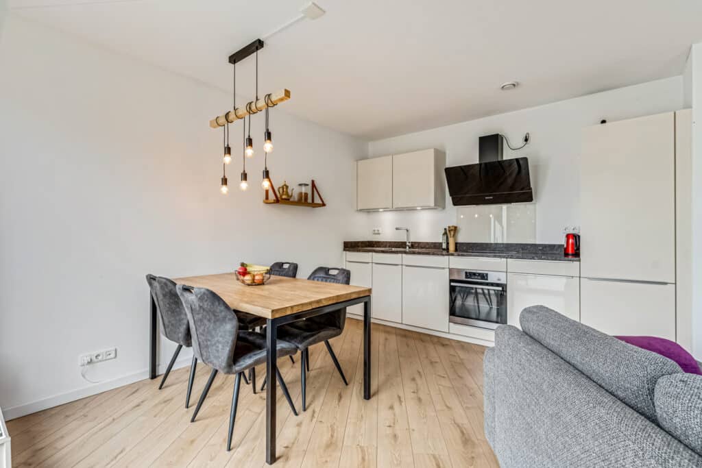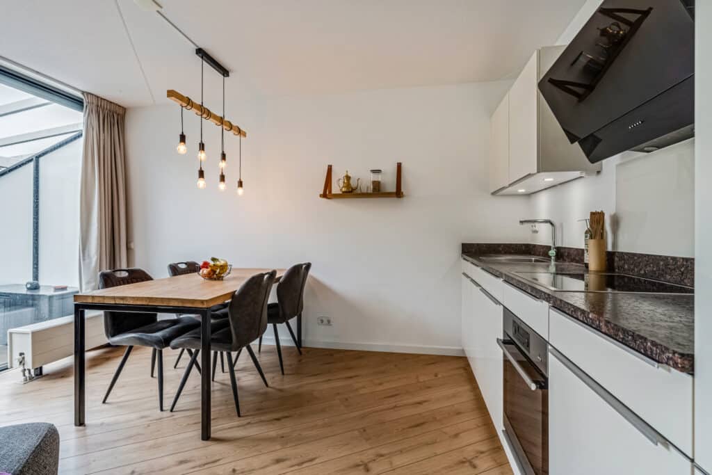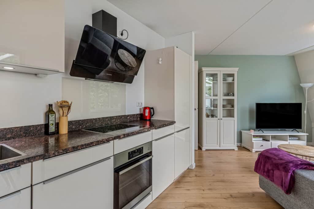 De open keuken is strak en praktisch ingericht in rechte opstelling. De combinatie van witte fronten met een stenen werkblad geeft een frisse uitstraling. Voorzien van een koel-/vriescombinatie, inductiekookplaat met design afzuiging, combi-oven, spoelbak en meer dan voldoende kastruimte.