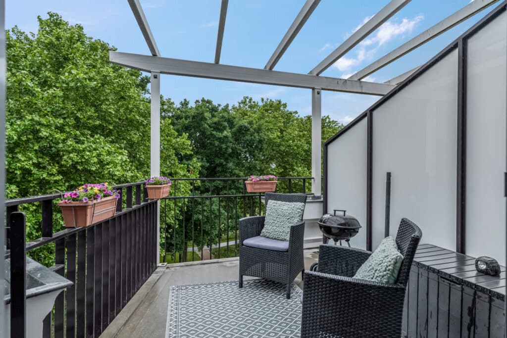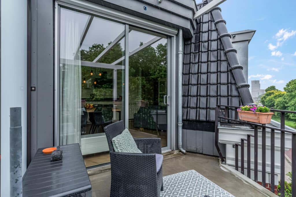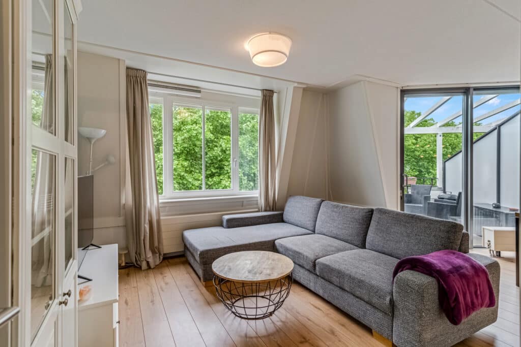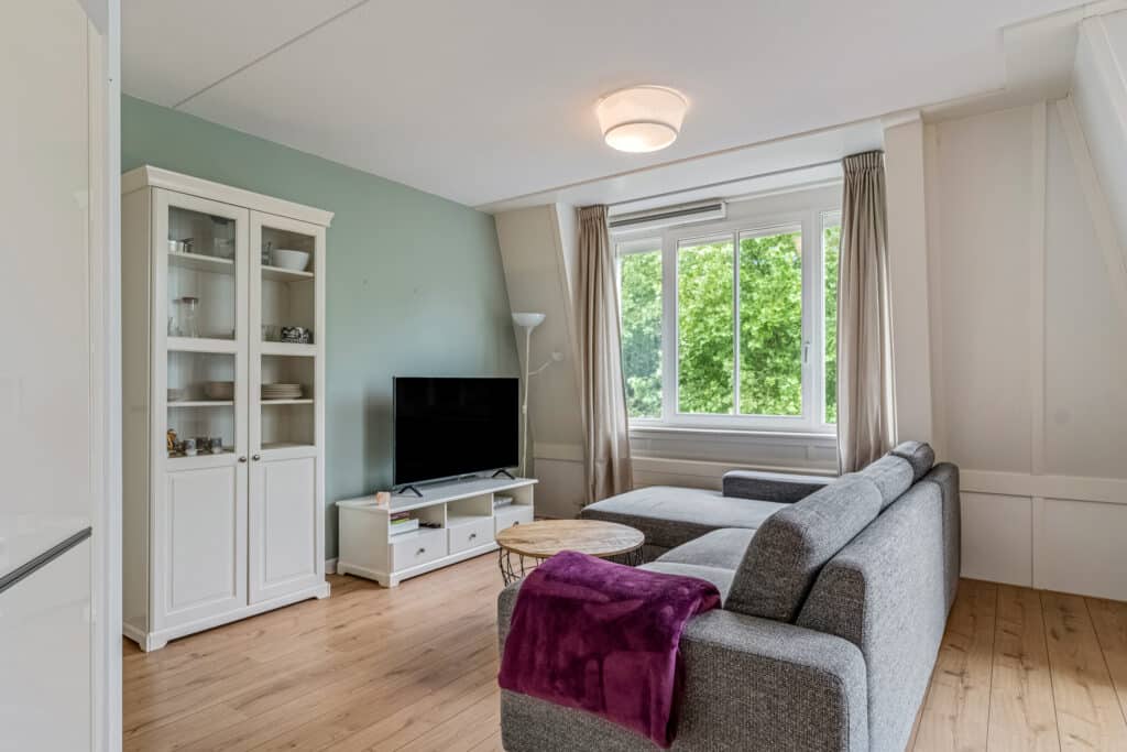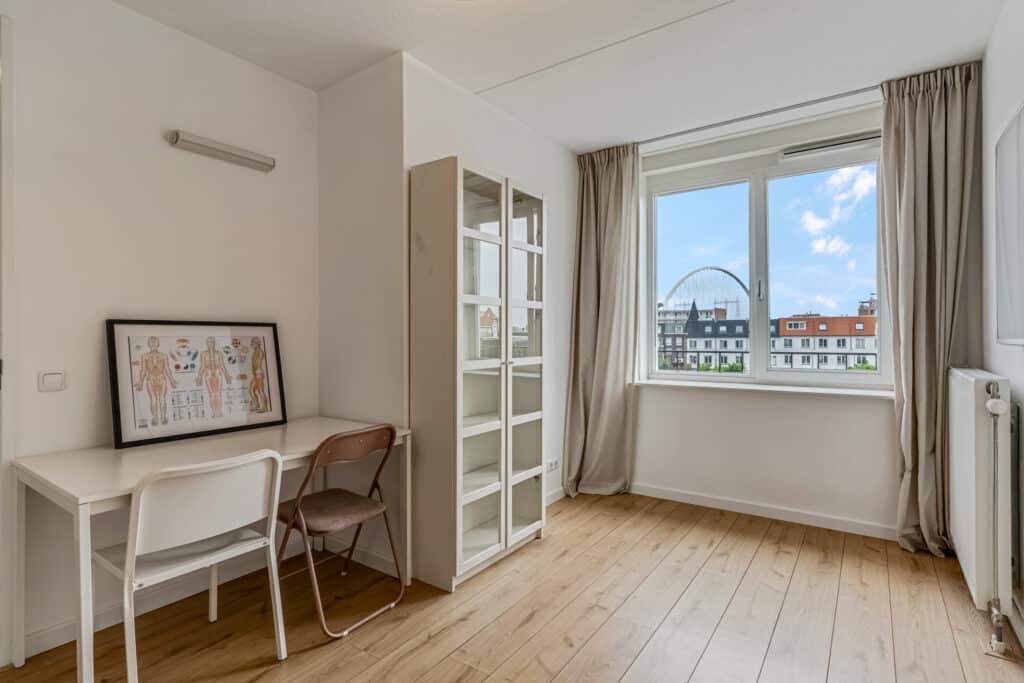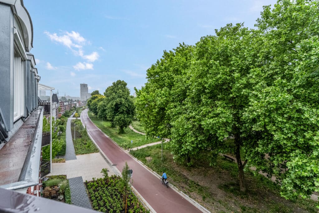 De lichte woonkamer aan de straatzijde biedt dankzij de grote raampartijen volop daglicht en een vrij uitzicht. Via een aluminium schuifpui stap je zo het grote balkon op – een heerlijke plek om te genieten van de zon, een kop koffie of het uitzicht op het Westerpark.