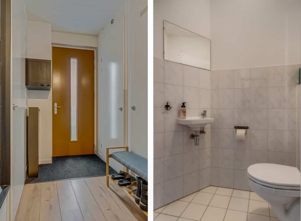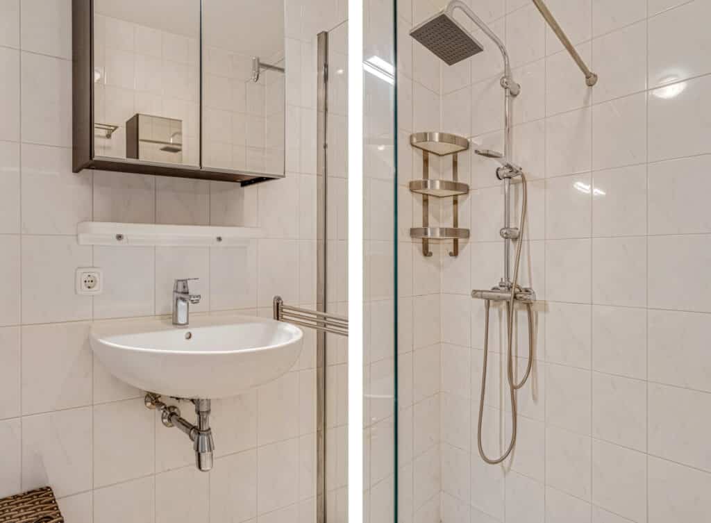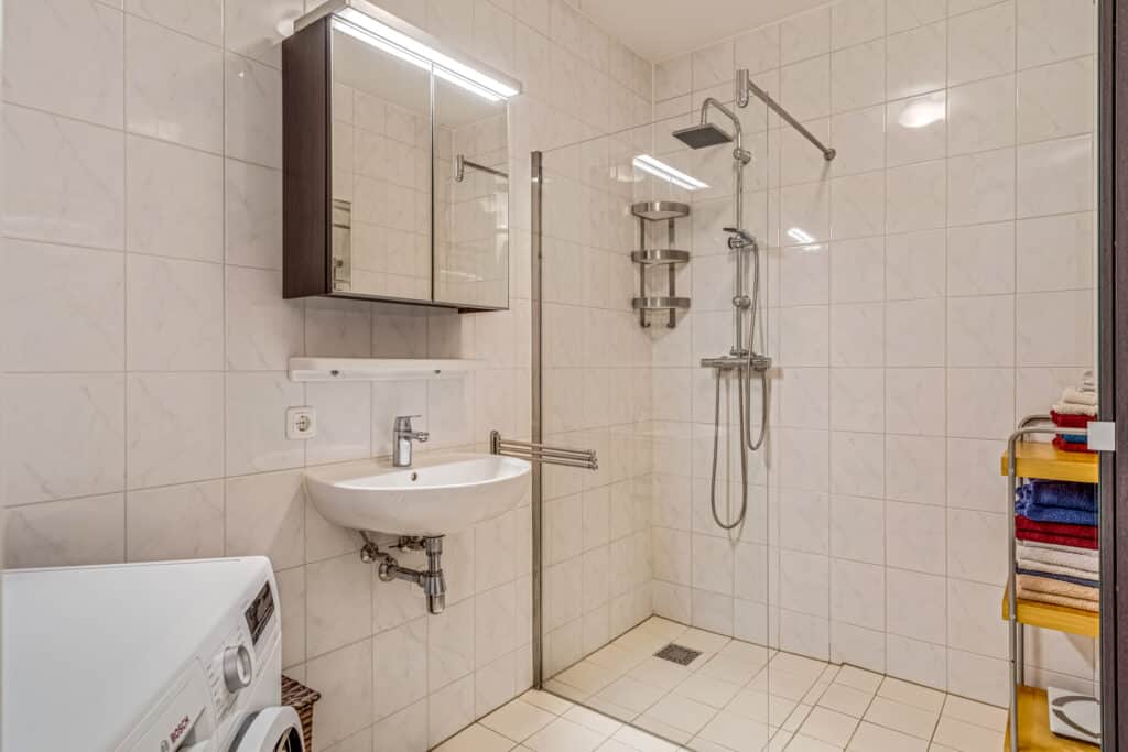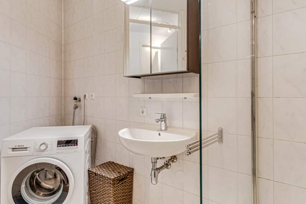 De badkamer is licht betegeld, ruim opgezet en voorzien van een inloopdouche, wastafel, én een praktische opstelplaats voor de wasmachine en droger. Daarnaast beschikt het appartement over een ruim toilet met fontein, modern en neutraal uitgevoerd.