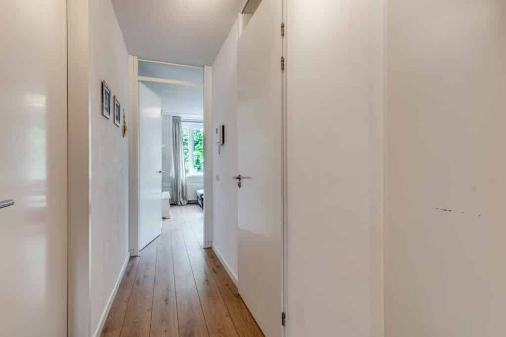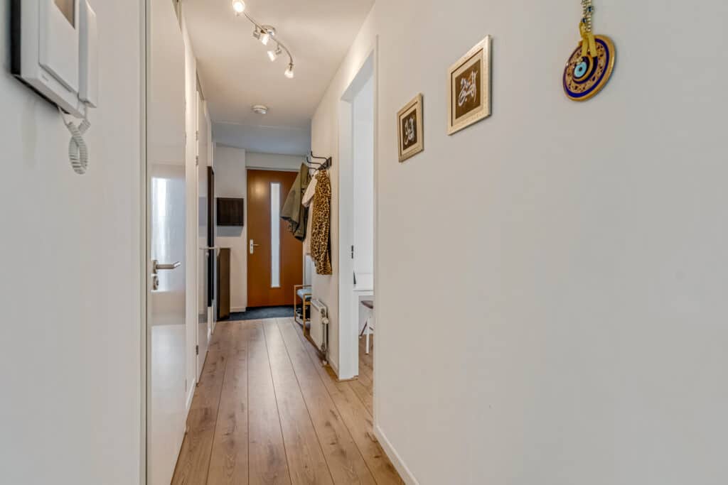 Het appartement is gelegen op de bovenste verdieping van het complex, wat zorgt voor rust, privacy én een fraai uitzicht. Via de nette galerij en het trappenhuis of de lift bereik je de woning. Je komt binnen in een lichte hal voorzien van een schoonloopmat, met toegang tot een gang die alle leefruimtes verbindt. De afwerking is modern en neutraal, met een doorlopende nette laminaatvloer in het hele appartement.